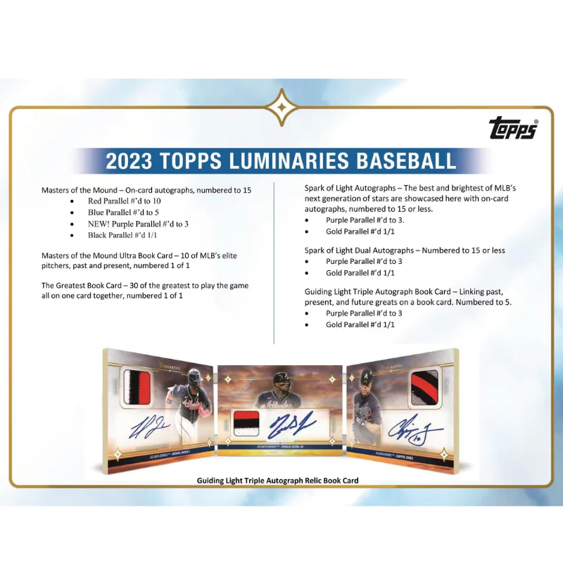 The 2023 Topps Luminaries Baseball Hobby Box delivers a luxurious, high-end experience for collectors and fans. Each box contains one encased autograph or autographed relic card featuring some of the most iconic names in baseball history. These cards are meticulously designed with stunning aesthetics, low-numbered serials, and on-card autographs, making them true centerpiece additions to any collection. Chase rare inserts like "Home Run Kings," "Hit Kings," and "Masters of the Mound" for a chance to own a piece of baseball greatness. With its focus on exclusivity and quality, this product is perfect for collectors looking to elevate their collection.