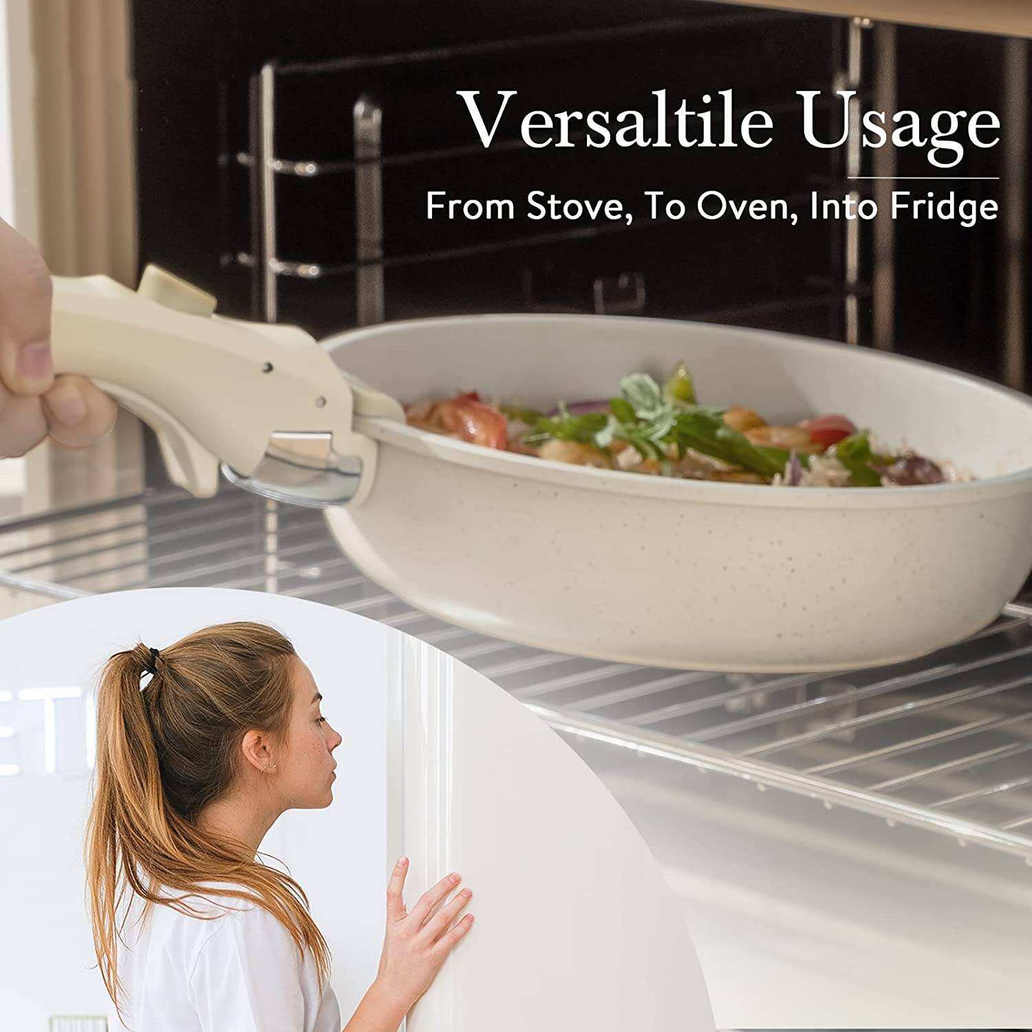 • ?For a Clutter-free cupboard: Optimal storage and easy stacking with the handles off saves up to 70% more space of detachable handle pots and pans set.