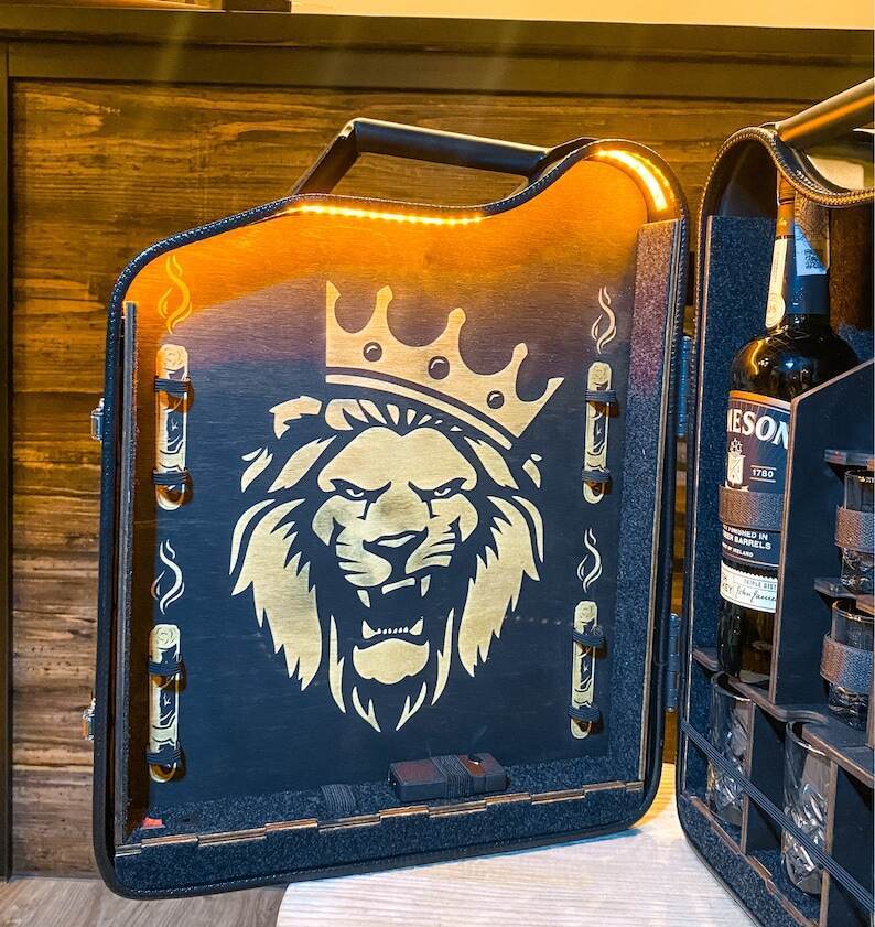 On the second side, we can make an individual engraving on any topic, it can be sports, hobbies, fishing, hunting, wishes or your drawing of your choice. 4 cigars are attached on the sides with elastic bands, below you can put a lighter and a cigar cutter