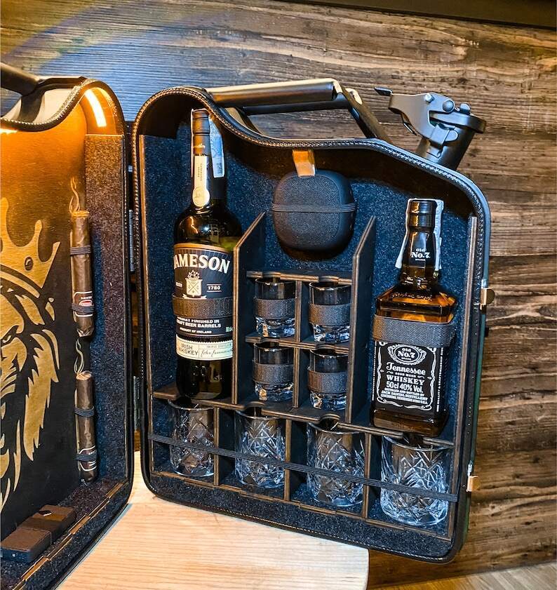 The minibar is made of a metal canister of 20 liters, height 18,5 in (47 cm). Inside a wooden box, designed for 4 glasses, 4 shot glasses, 2 bottles, as well as a built-in bluetooth speaker at the top. You can insert a USB flash drive or connect via bluetooth to listen to your favorite songs. A charging cord is included. All dishes are securely fixed with elastic bands.