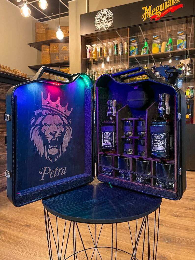 Own production, so we can implement any of your wishes and send it as soon as possible. The inscription on the front door of the canister-bar will be applied as a gift