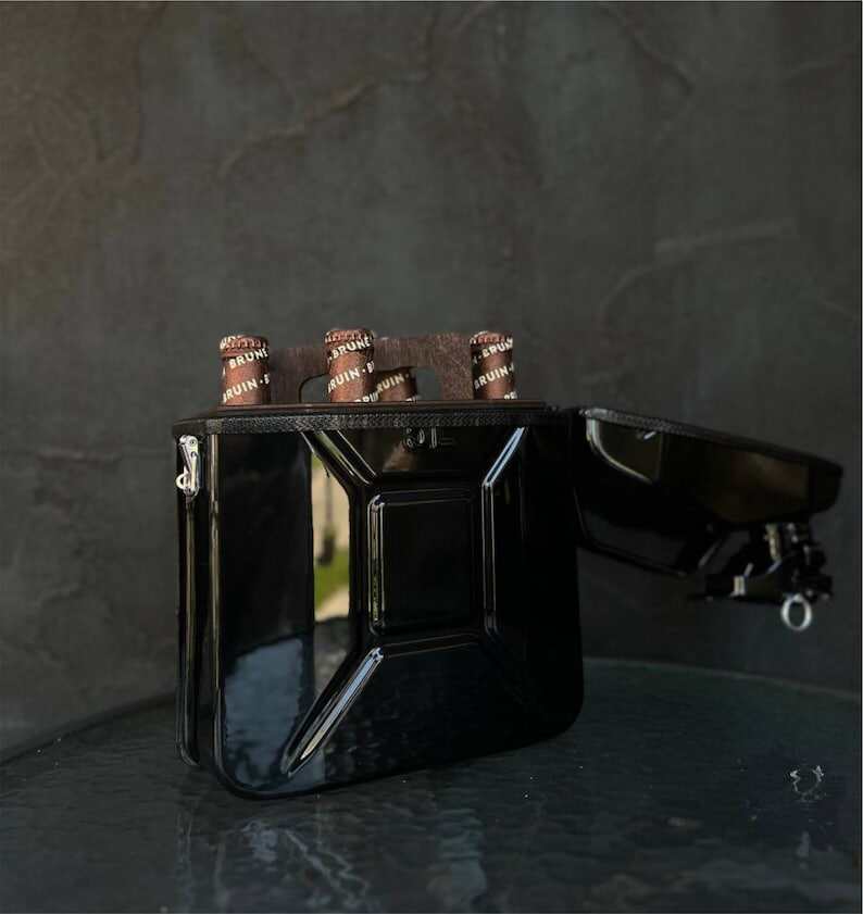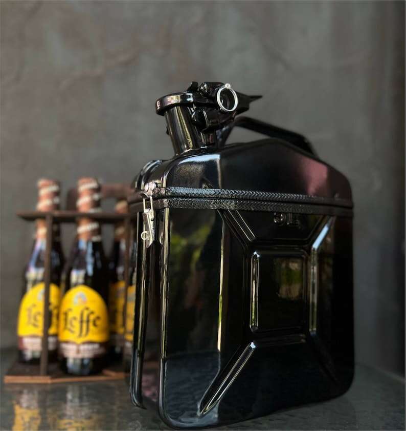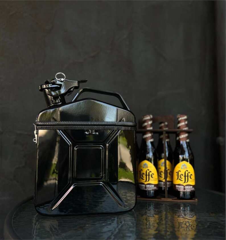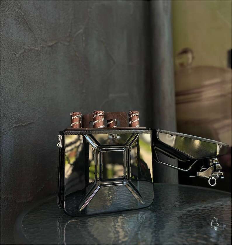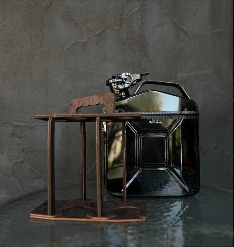 At first glance, this is a real 5 liter fuel can, but inside you will find a real surprise. Mini-bar, which holds a bottle of 0.33 l, 4 pcs. Inside there are wooden shelves, all the utensils above are fixed with rubber bands.