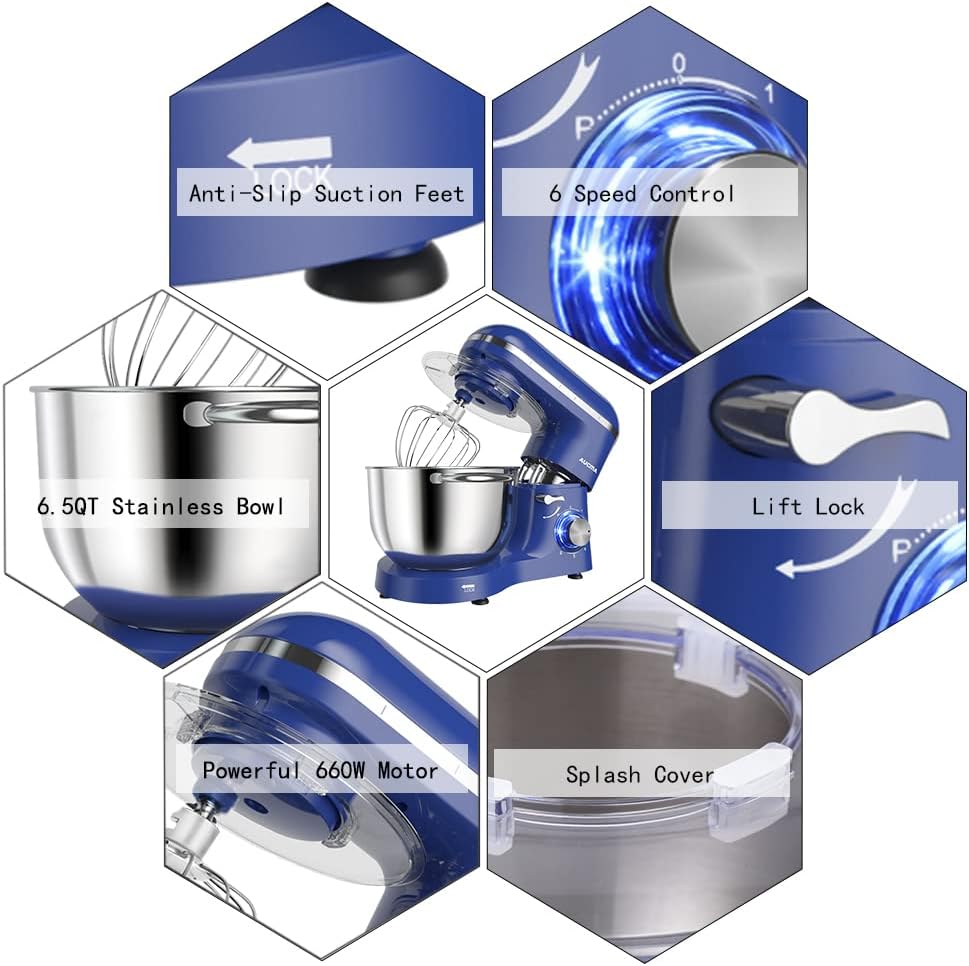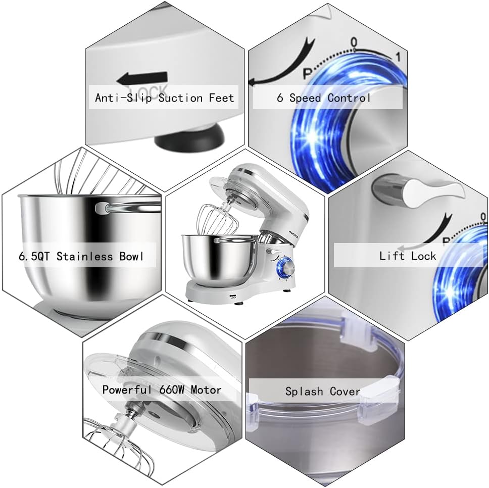 - Multiple Attachment Set - Aucma stand mixer comes with three mixing accessories: whisk, dough hook, mixing beater.The splash guard with access hatch helps add ingredients without making a mess.