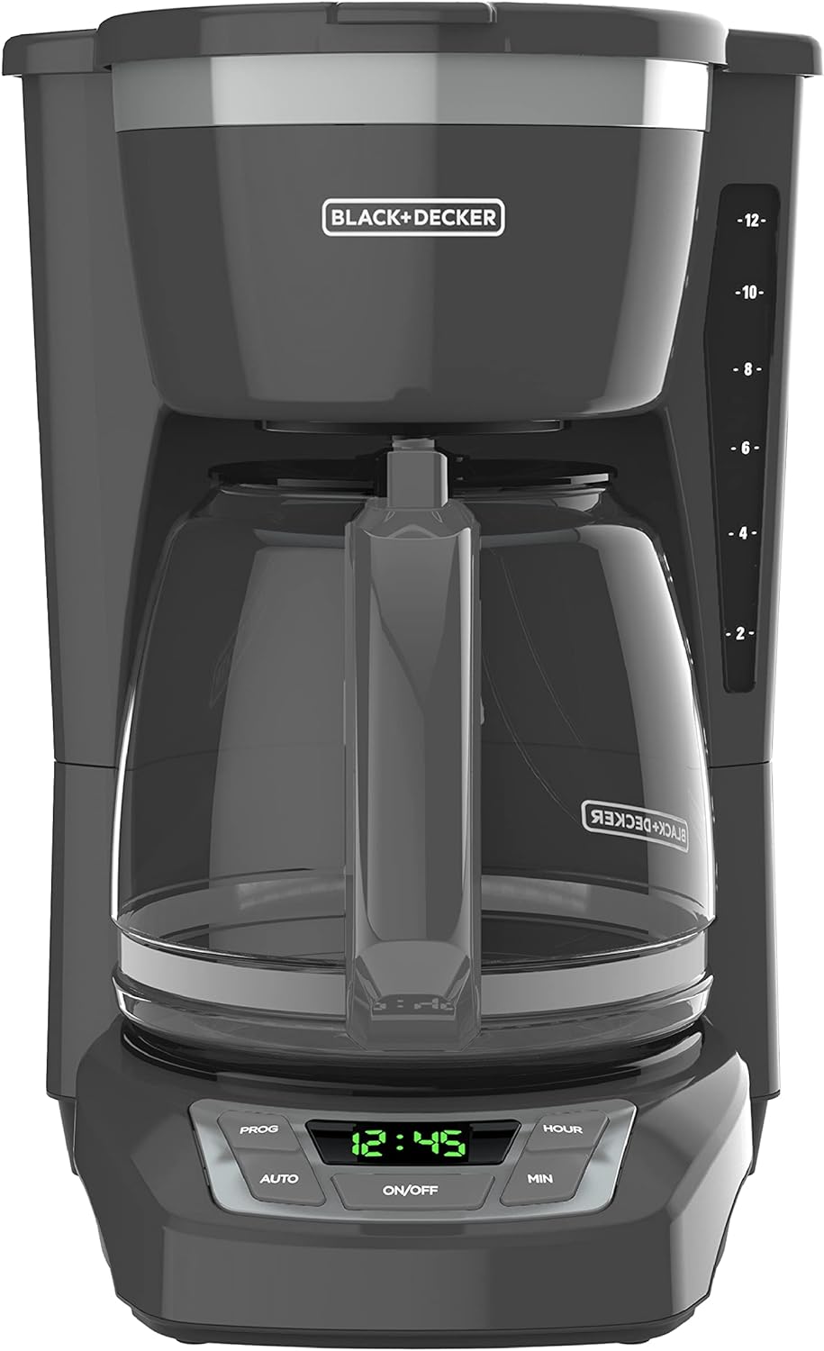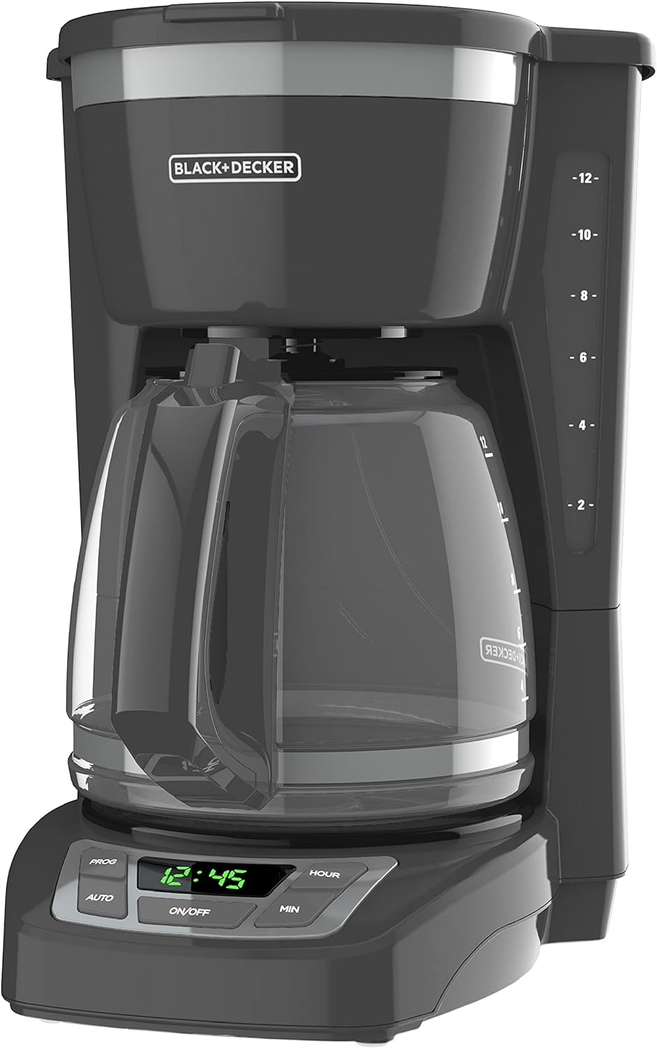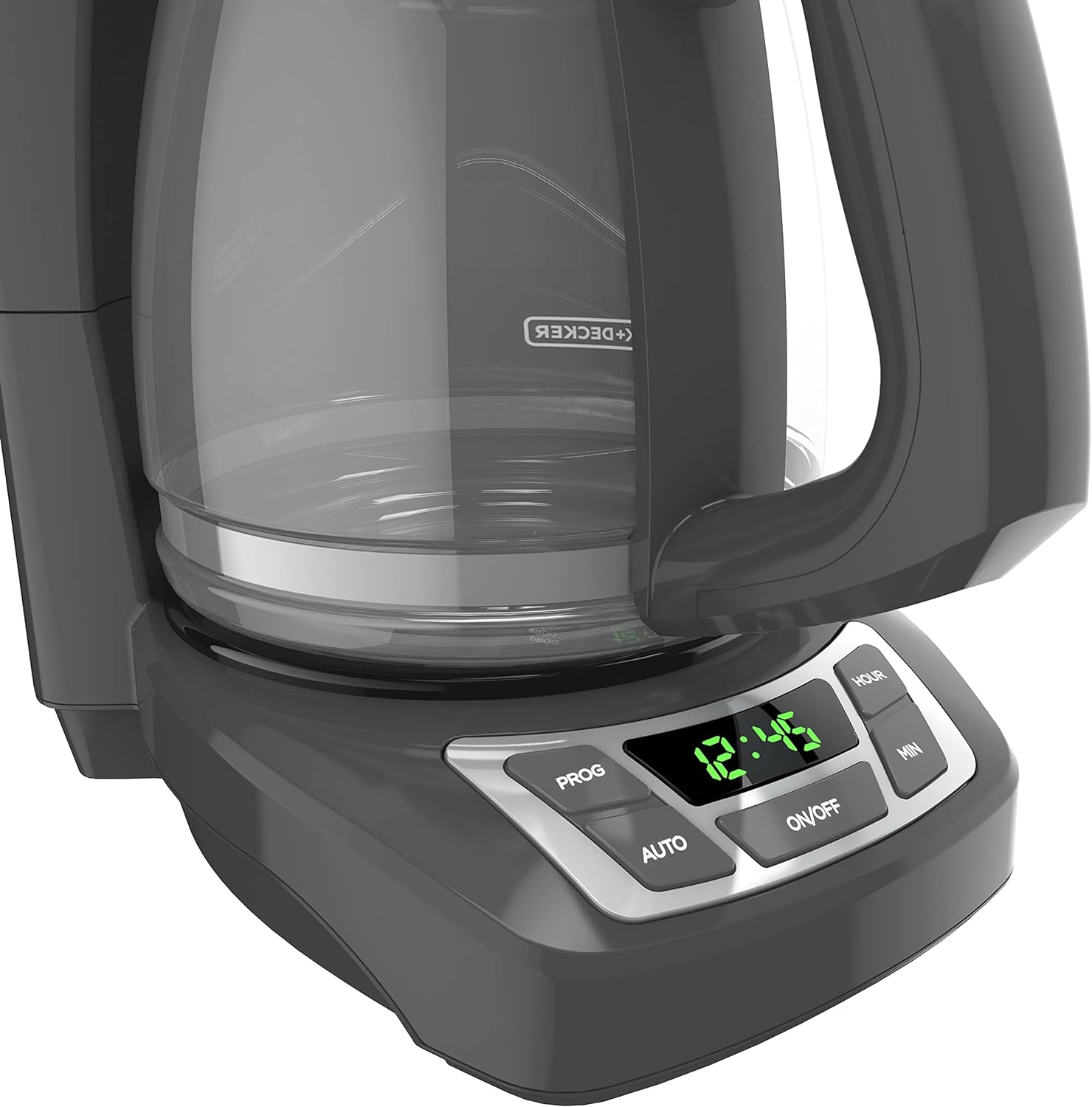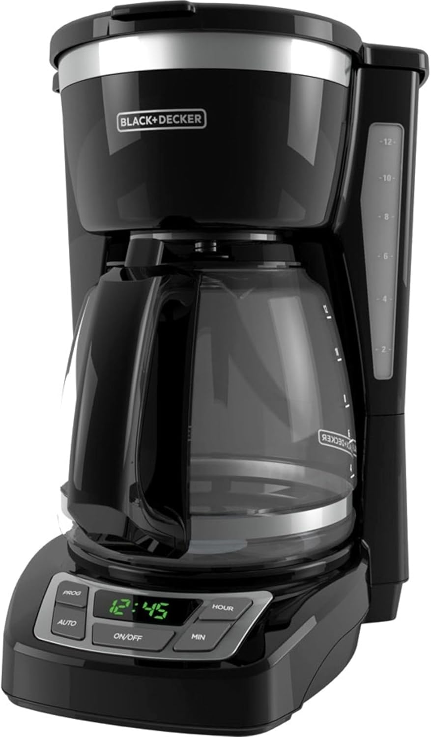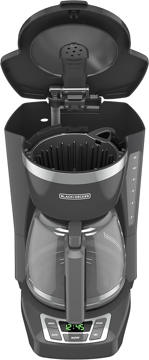 • BLACK+DECKER 12-Cup Digital Coffee Maker, Programmable, Washable Basket Filter, Sneak-A-Cup, Auto Brew, Water Window, Keep Hot Plate, Black