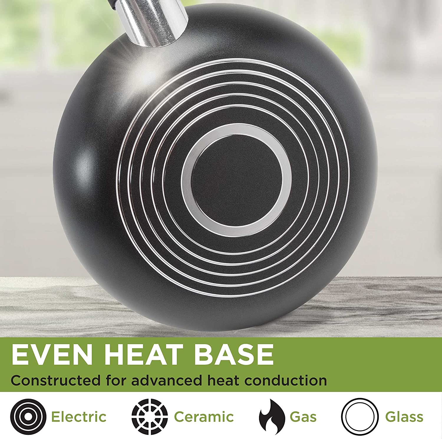HEALTHIER NONSTICK COOKING: This pots and pans set features a durable, high-performance, long-lasting, multilayer non-stick coating that allows food to easily slide out of the pan without adding extra oils. Manufactured without PFOA. Pans have ergonomic grip handles making them easy to maneuver.