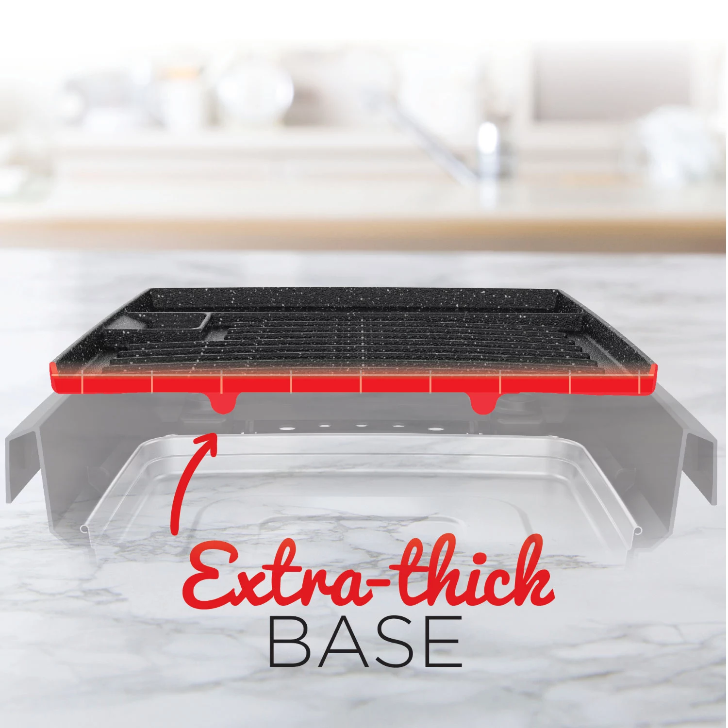 Extra-thick cast aluminum plate Large 10 x 16cooking surface Adjustable temperature control Grills indoors without charcoal or gas Excess oil and grease falls into the water-filled dip tray reducing smoke