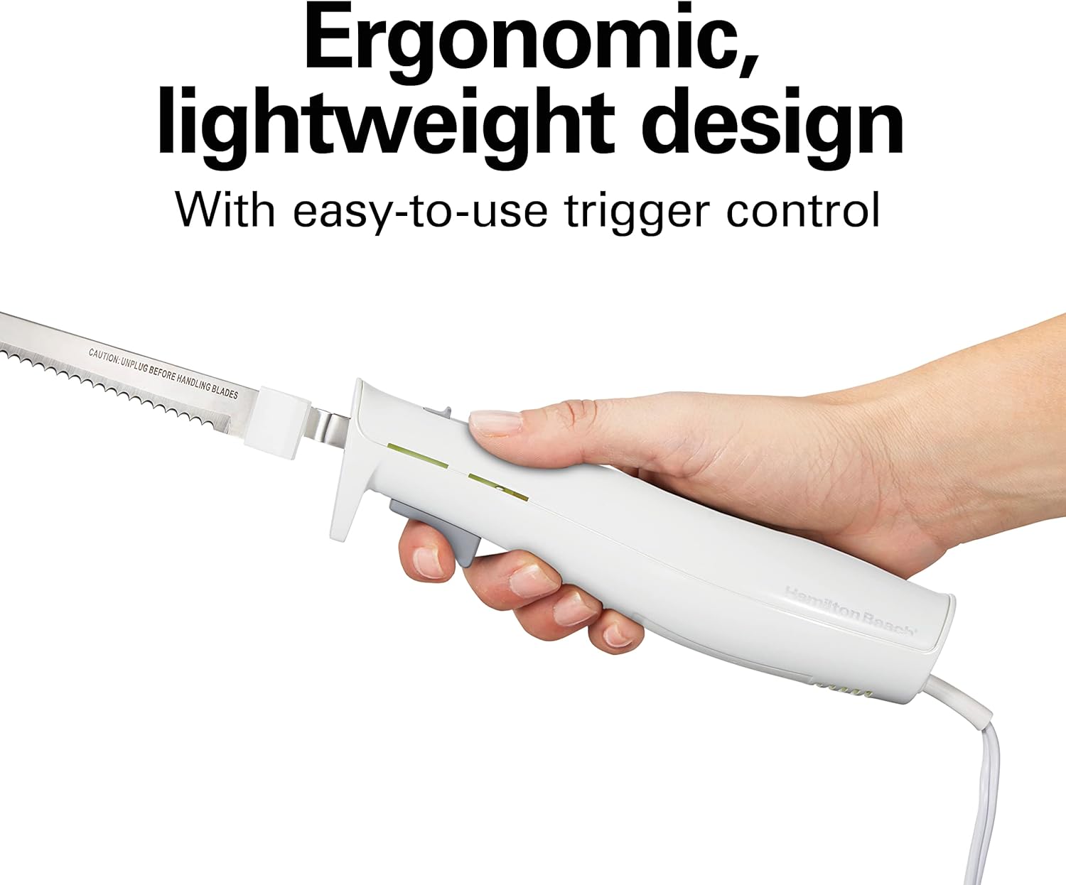• Hamilton Beach Electric Knife Set for Carving Meats, Poultry, Bread, Crafting Foam & More, Reciprocating Serrated Stainless Steel Blades, Ergonomic Design Storage Case + Fork Included, 5 Foot Cord