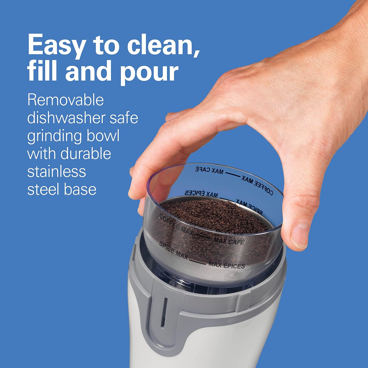 - DURABLE STAINLESS STEEL BLADES: With the durable stainless steel blades, this grinder makes easy work of grinding everything from coffee beans to herbs and spices.