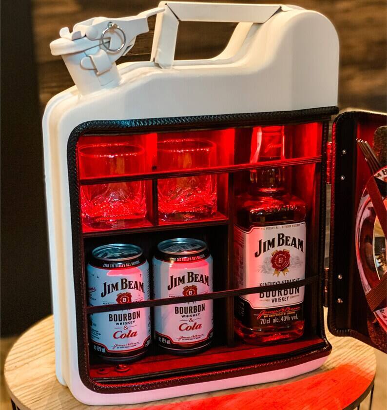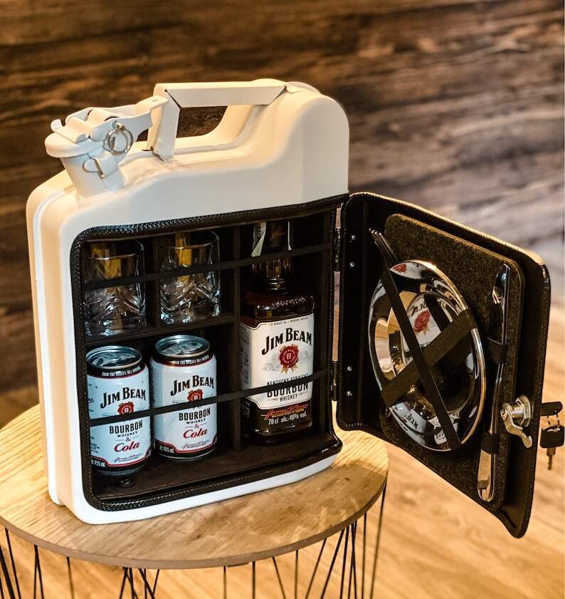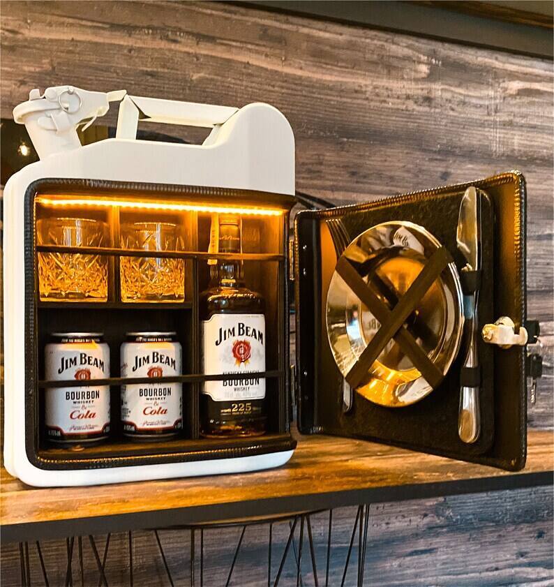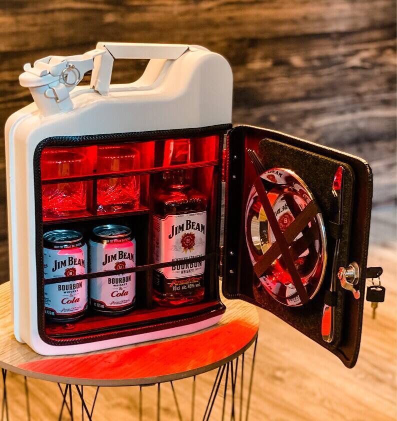 At first glance it looks like a real 10 liter fuel tank, but inside you will find a real surprise. Mini bar that holds a 0.7L bottle, 2 glasses, 2 Pepsi, 2 plates, 2 knives and 2 forks.