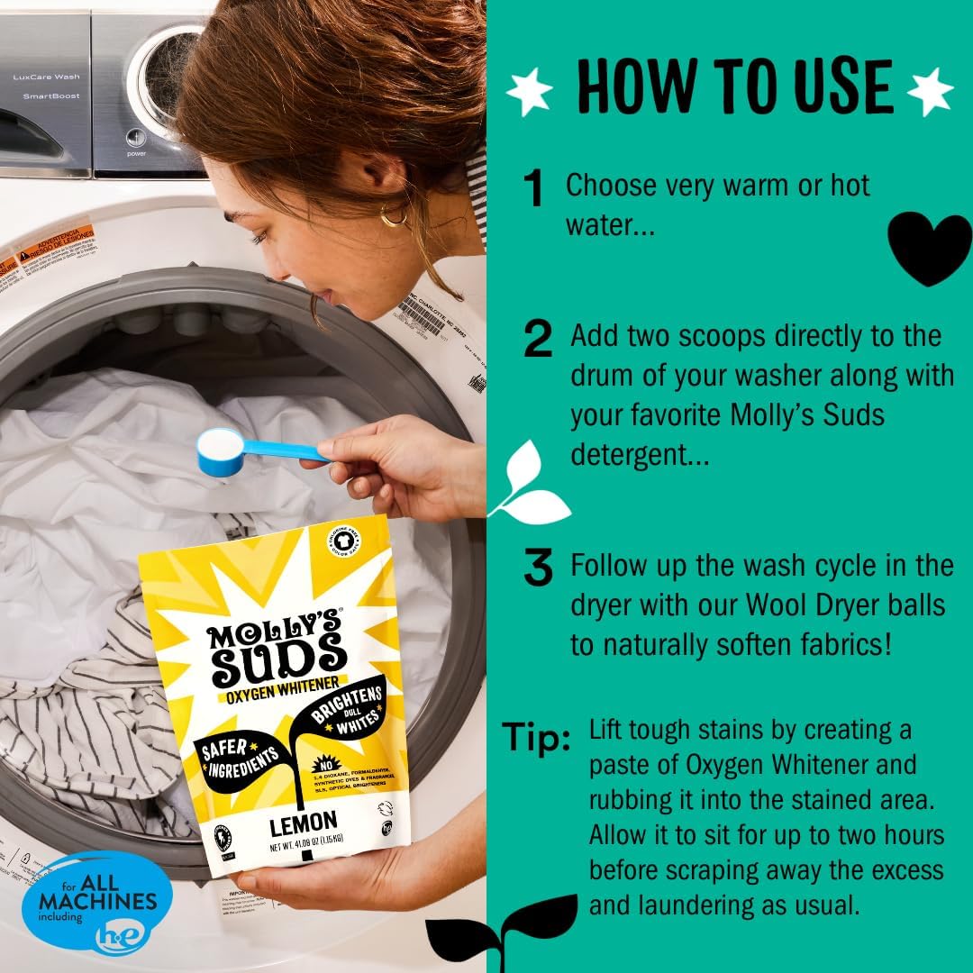 - WHAT'S INCLUDED: (2) 79 ounce bulk bags (158 ounces total) of Oxygen Whitener odor eliminator laundry whitener with a measuring scoop. Compatible with both standard and HE washing machines. Oxygen Whitener cruelty-free laundry soap is safe for most fabric types. Do NOT use this product on wool, leather, or silk.