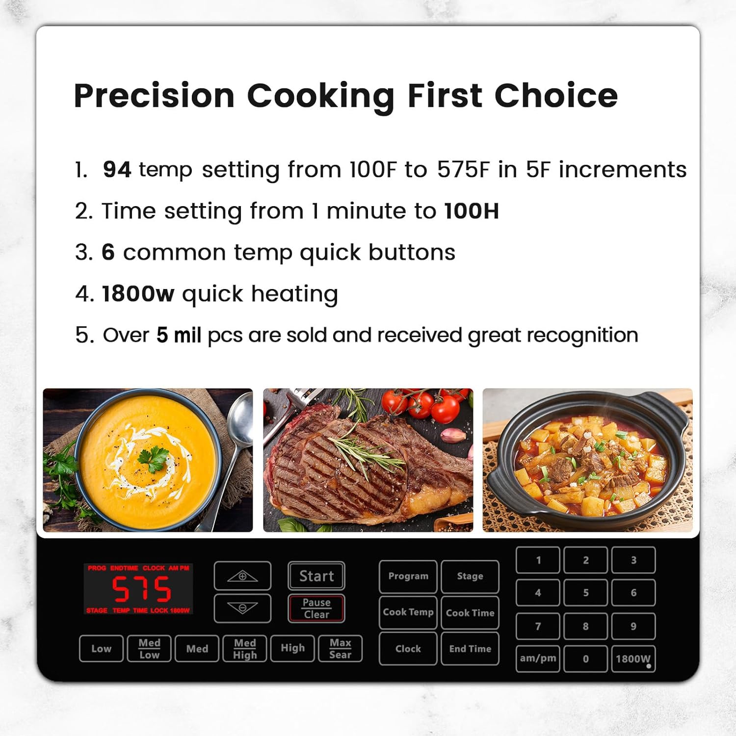 - PRECISE TEMPERATURE CONTROL – With 94 precise temperatures at your fingertips, you can keep delicate sauces warm at 100°F to grilling a juicy steak with serious grill marks at 575°F.