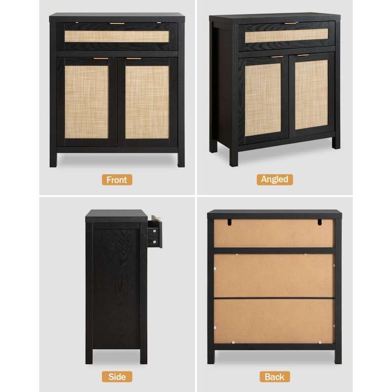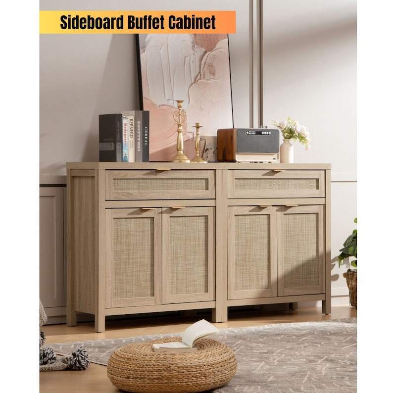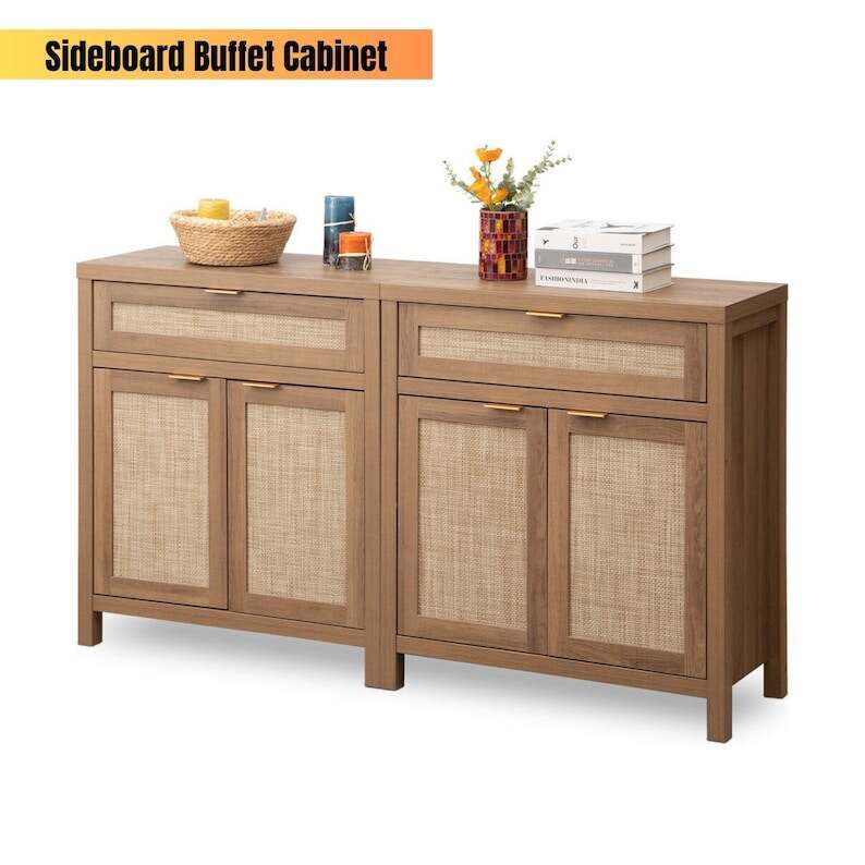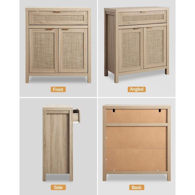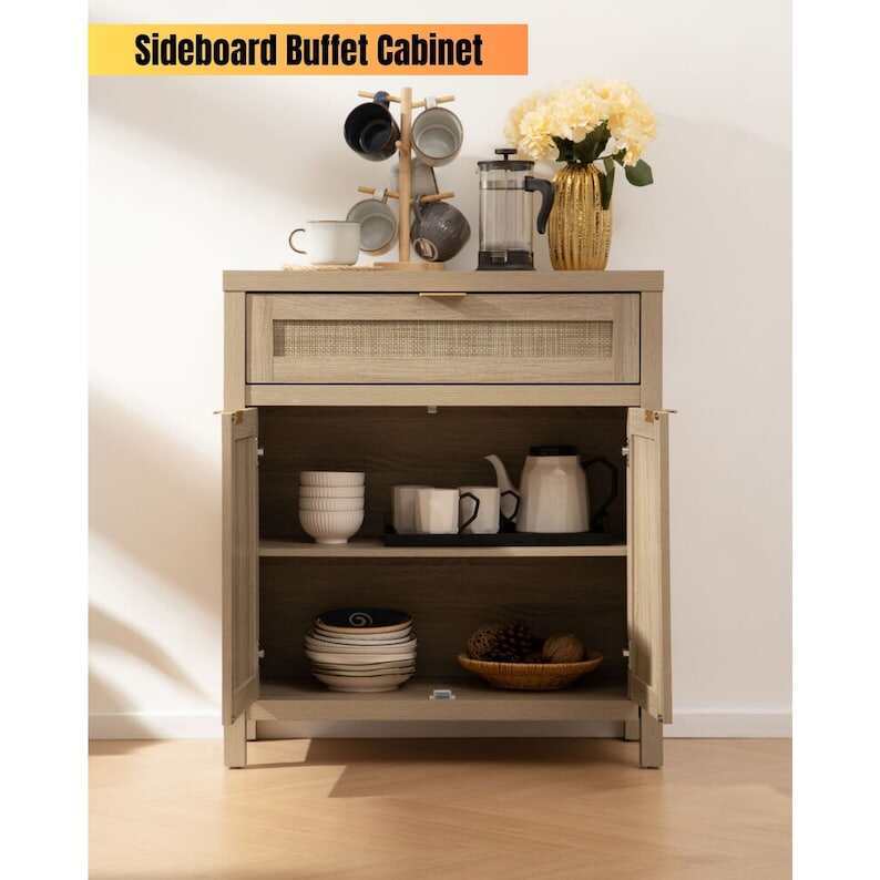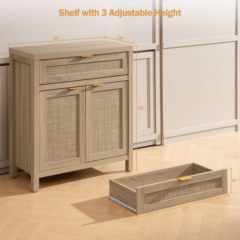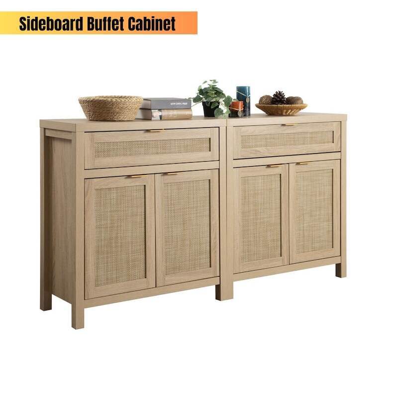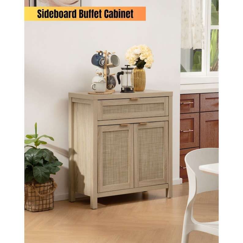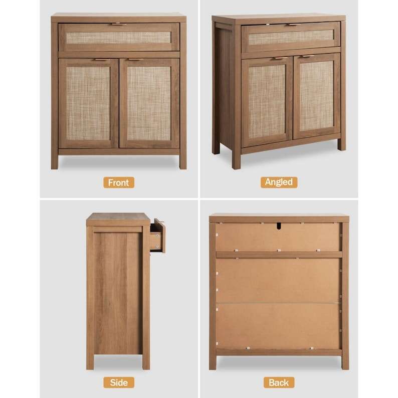 【MULTIFUNCTIONAL CABINET】 - As a sideboard or buffet server cupboard in the dining room or kitchen, all-purpose storage cabinets can suit your diverse storage demands. Waterproof paint on the cabinet surface, along with a natural rattan ornamented door, efficiently prevents moisture, allowing it to be used as a bathroom floor cabinet as well. The traditional wood color cabinet and wood color doors blended retro and modern, it may be perfect for various home décor styles, providing a touch of unadorned elegance to your area.