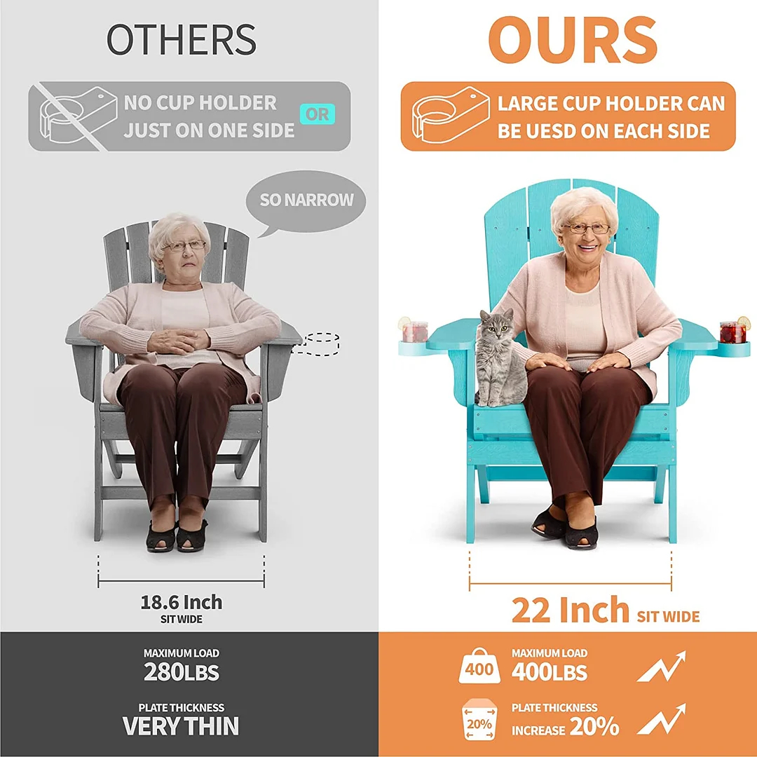 - 【WEATHER RESISTANT AND FADE-PROOF】- Adirondack Chair adopts new Color retaining technology, made of high-quality, HIPS materials, this chair is built to withstand the elements for long-lasting durability won't fade, splinter, crack, chip, peel, or rot when exposed to the elements.