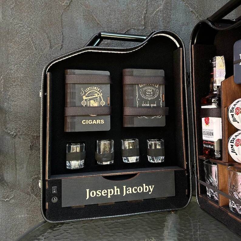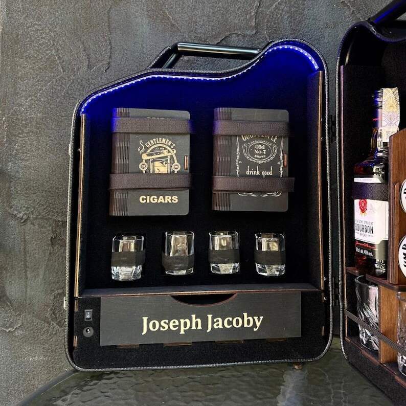 A box with cooling stones for whiskey, a box of cigarette cases, 4 shot glasses and 4 glasses for whiskey. There is also a built-in bluetooth speaker. You can listen to your favorite music through a USB flash drive or connect via bluetooth. Drinks are not included in the price. A drawer for storage, such as a cigar cutter, lighter, or other accessory.