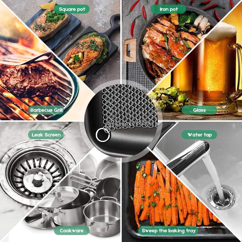 - Unmatched Durability: This cast iron skillet cleaner is machine soldered by Premium 316L Stainless steel, It is ideal for cleaning all your cast iron cookware. Boasting unmatched durability and built to last as long as your cast iron products. Each chainmail ring is designed with the highest quality food grade stainless steel in the industry to be smooth enough for pans, scrub any residue with warm water which will release quickly and easily