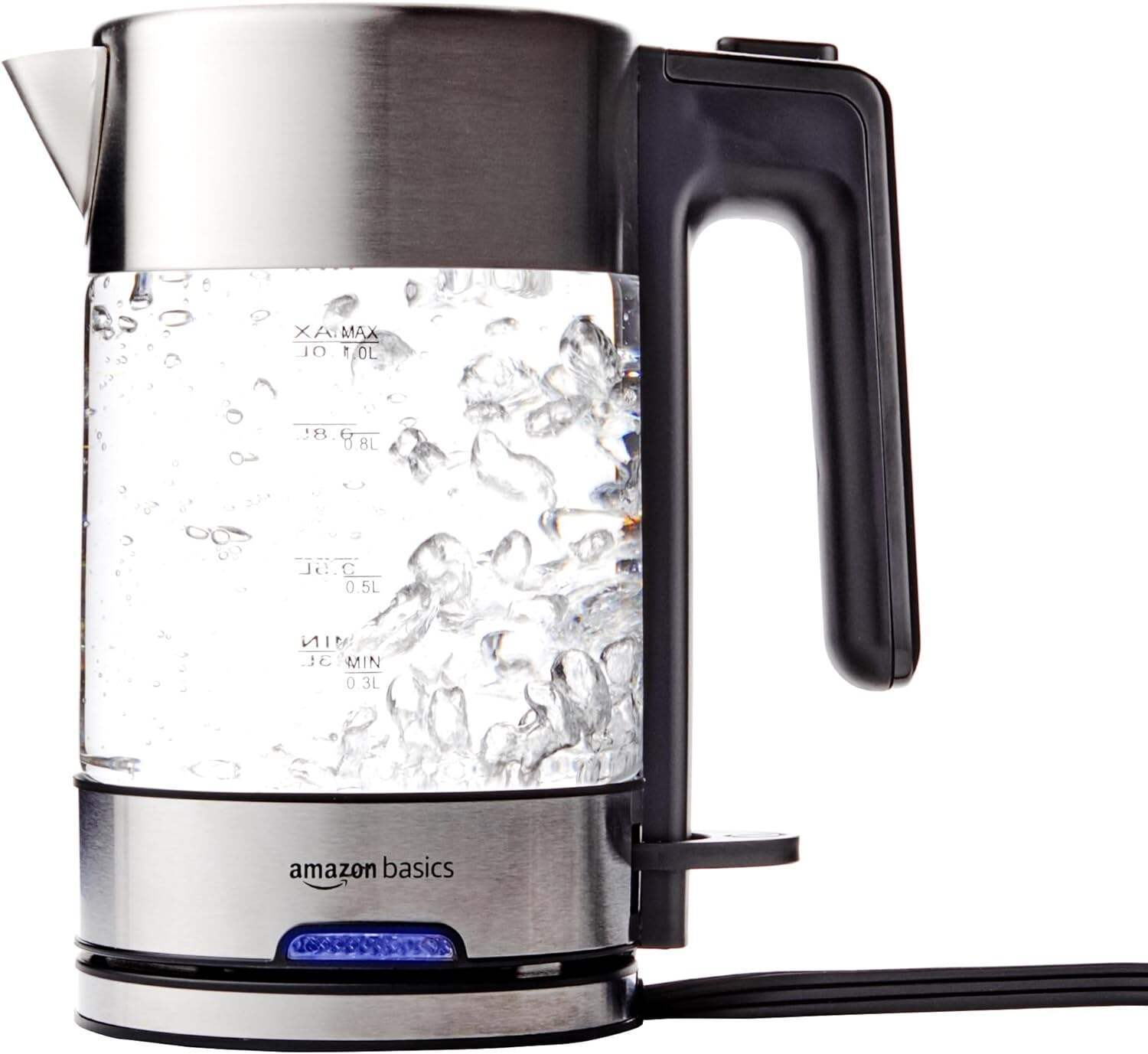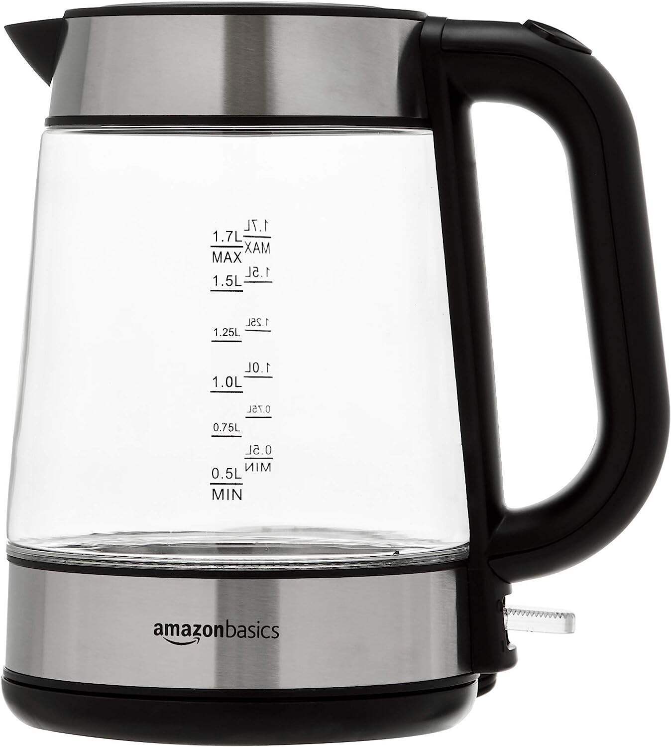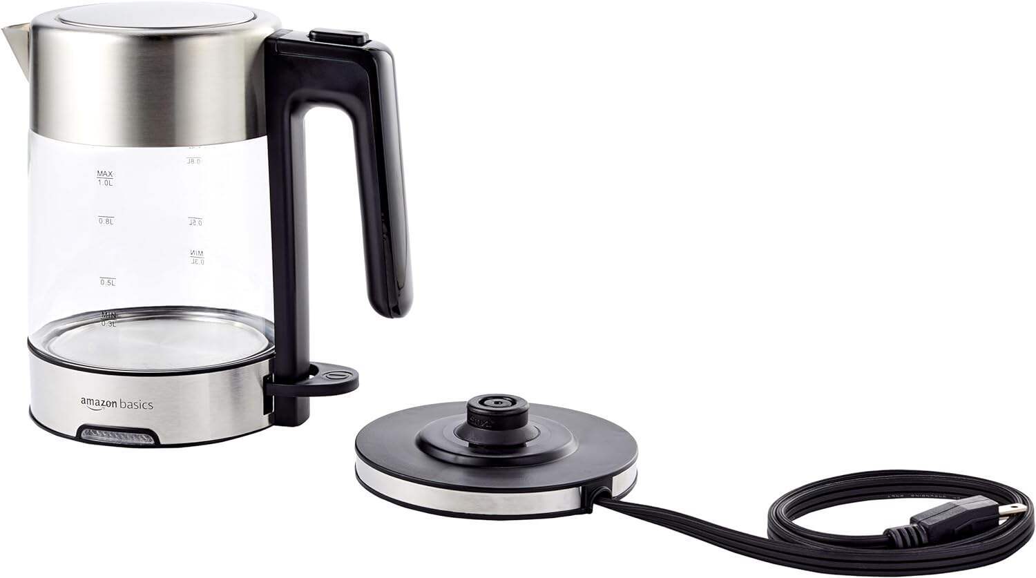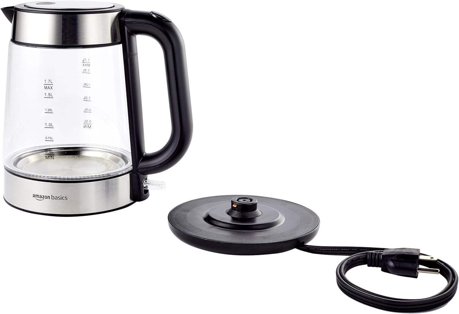 - Electric kettle with a 1.7-liter cordless glass carafe
