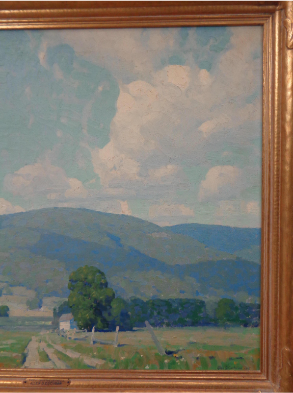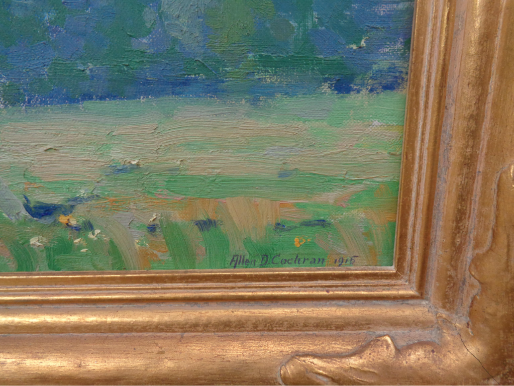 Biography Allen Dean Cochran Born in Cincinnati, Ohio, Allen Dean Cochran received his art training from two very notable artists of his day, that being Kenyon Cox of Ohio and Birge Harrison of Woodstock, both members of the National Academy. Cochran moved from Ohio to Woodstock where he became a member of the Woodstock Artists Association. He exhibited with that group and at the National Academy, Corcoran Gallery of Art, Art Institute of Chicago, and Pennsylvania Academy of Fine Art. He was also a member of the Salmagundi Club. Source: Covington Gallery Known for his winter scenes, here is an exquisite example of Cochran's talent and artistic vision with this summer piece. The application of paint is just beautiful to view in person and i tried to show that with my pics here. Looks to be an original period frame also. DESCRIPTION "Foothills of the Catskills," 1915 Oil on canvas Signed and dated lower right: Allen D. Cochran, titled on the frame plaque 24" H x 30" W CONDITION Visual: Generally good condition. Craquelure scattered throughout. Minor stretcher bar creases along the four edges. Minor surface dirt and grime. Blacklight: No evidence of restoration under blacklight. Frame: 28.5" H x 34.5" W x 2.25" D SELLERS STATEMENT I have been in the art business as an artist and dealer since the early 80's. Almost 40 years now. I primarily concentrate on my own art. My art is derived in a variety of ways. I'm a responder. I respond to light, color, design, etc and I love painting both outdoors on location and in the studio under a controlled environment. I try to convey an idea, mood or just simply a beautiful setting. I'm inspired by a wide variety of subject matter and styles of painting and do not adhere to just one way. My paintings have won numerous awards over the years and have been collected both nationally and internationally. They can be found in three museum collections, the White House Collection and many private collections.
