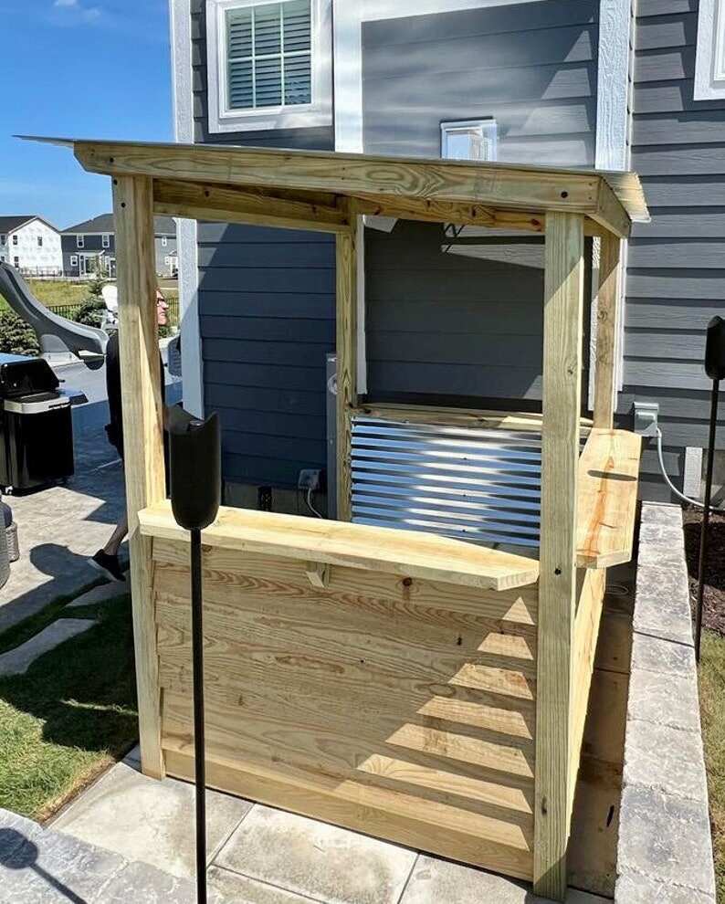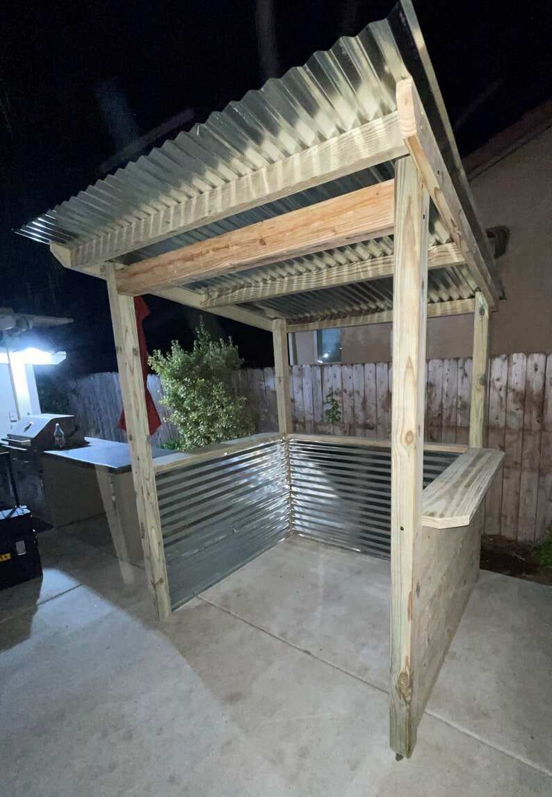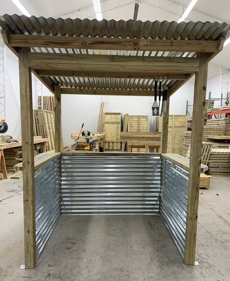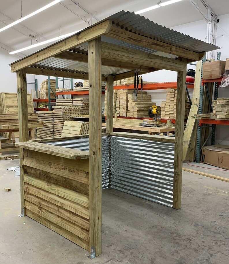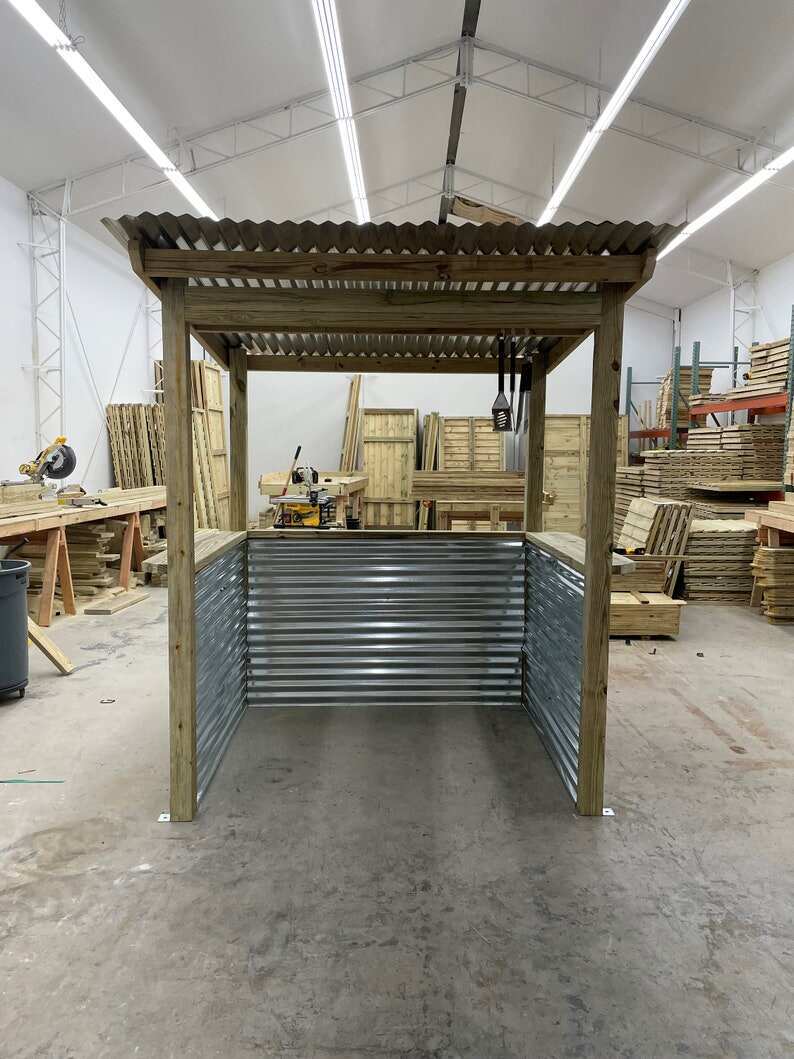 It is constructed using yellow pine pressure treated lumber. The roof, as well as the internal face of the (3) walls are lined with corrugated galvanized steel sheeting.