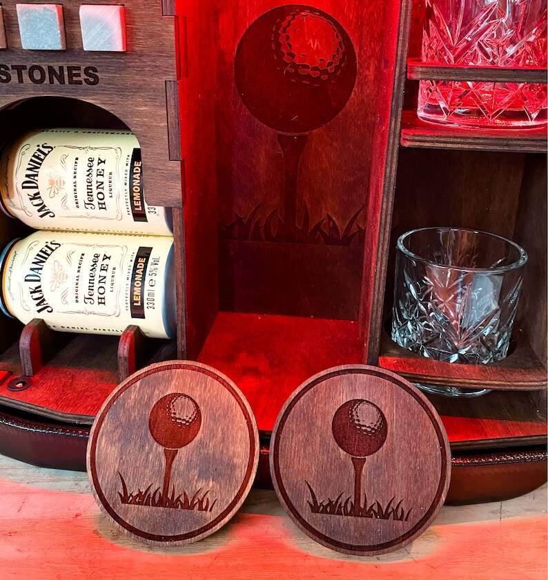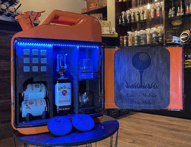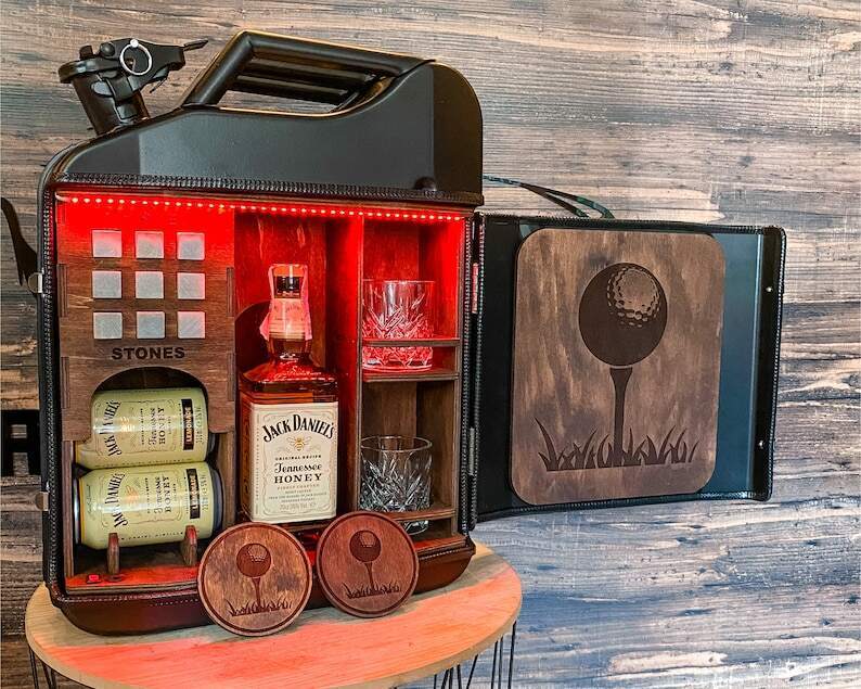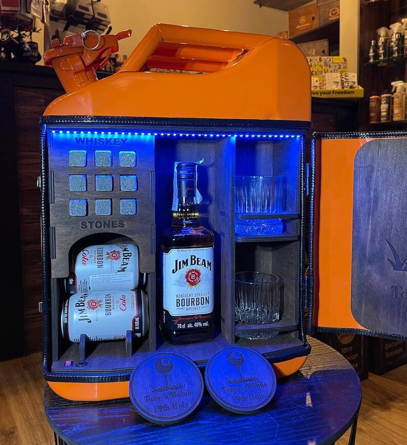 Mini bar that holds a 1L bottle, 2 glasses, 3 Pepsi, whiskey cooling stones and 2 coasters. Inside, on the canister door, we can make engraving on any topic, hobby, sports, hunting, fishing or any other pattern, as well as engraving on the back of the canister and on craters.