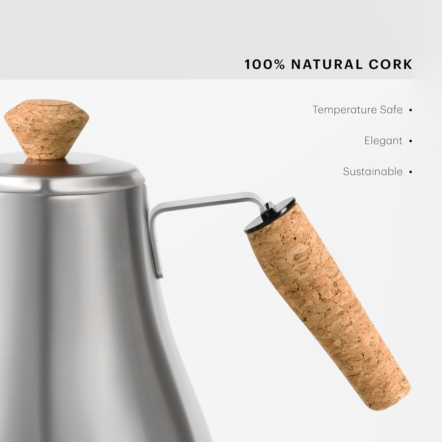 | Special Feature | Elegant, ergonomic design that gives you full control over the speed and consistency of the water flow for optimum pour over brewing, Non-slip handle and knob made from natural, sustainable cork that protects your hands and is supremely comfortable to use, Stylish base with easy-to-use power switch and automatic shut-off for peace of mind, Electric gooseneck kettle, ideal for use with pour over coffee makers 0.8 liter / 27oz capacity, Made of attractive, durable stainless steel |