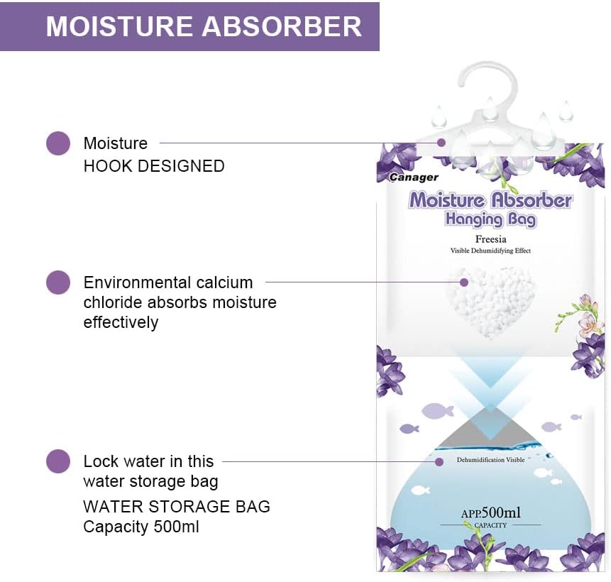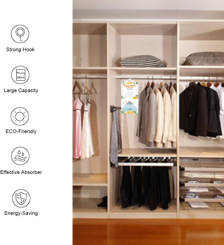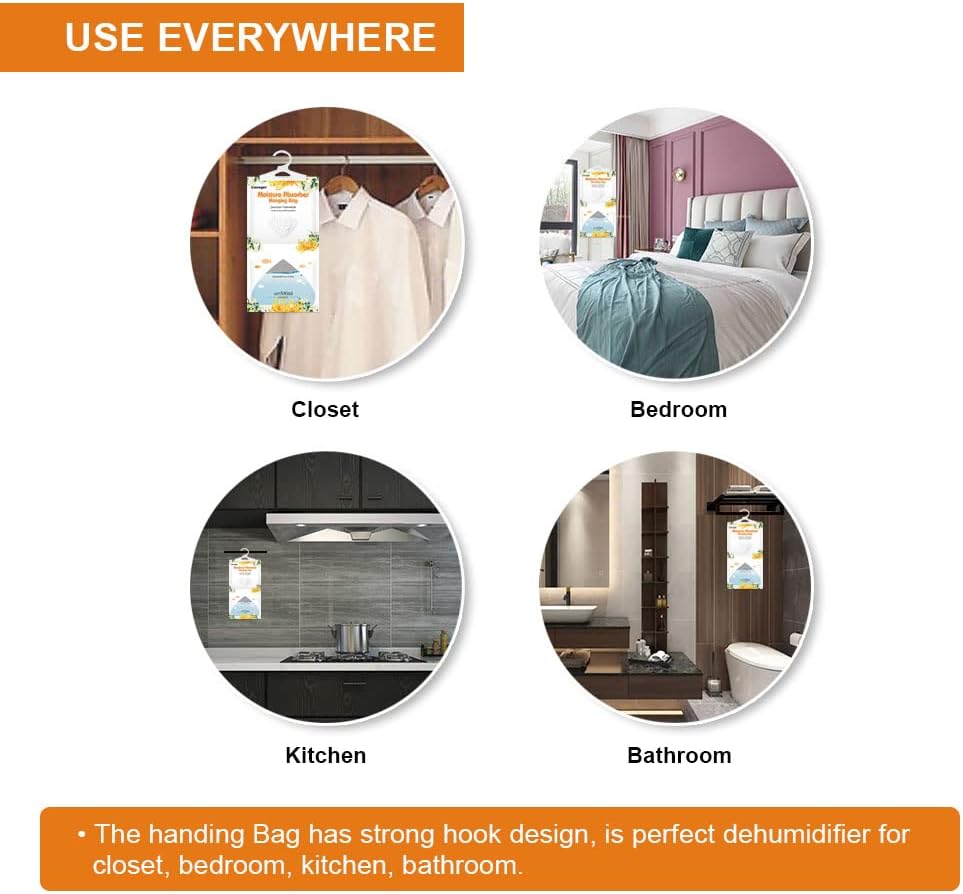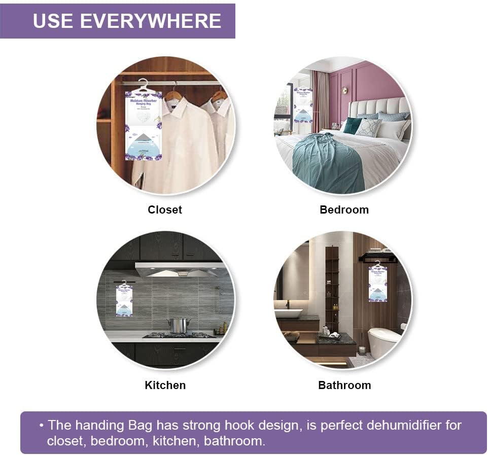 - The hanging Bag has strong hook design,is perfect dehumidifier for closet,bedroom,kitchen,bathroom.