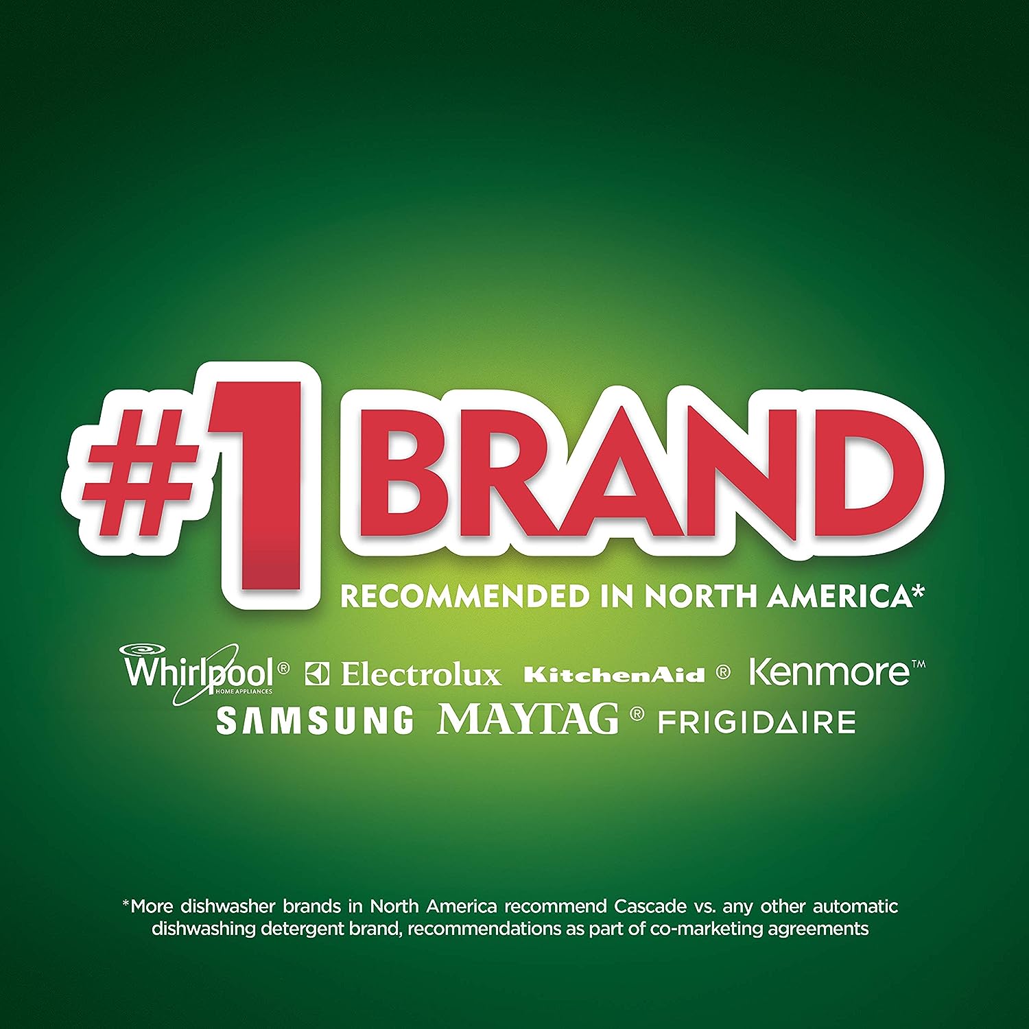 - #1 Recommended Brand in North America* *More dishwasher brands in North America recommend Cascade based on co-marketing agreements vs. other automatic dishwasher detergent brands