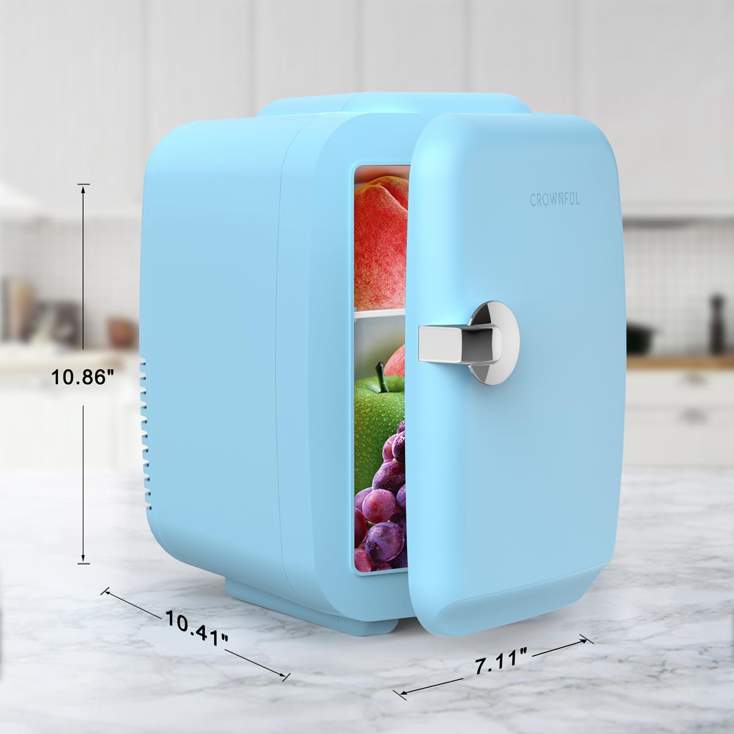 • [Compact and Portable] The Crownful mini fridge has a 4-Liter capacity that can store up to six 12 oz. soda cans. The interior size is 5.33x6.05x7.96 inches. It comes with a convenient carry handle and a detachable shelf, making it simple to transport. Excellent for use in bedrooms, offices, dorm rooms, road trips, boats, campgrounds, and more.