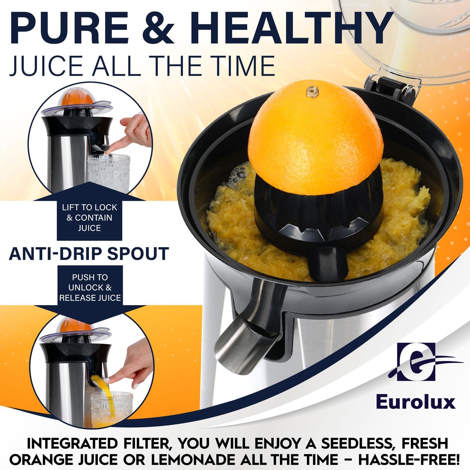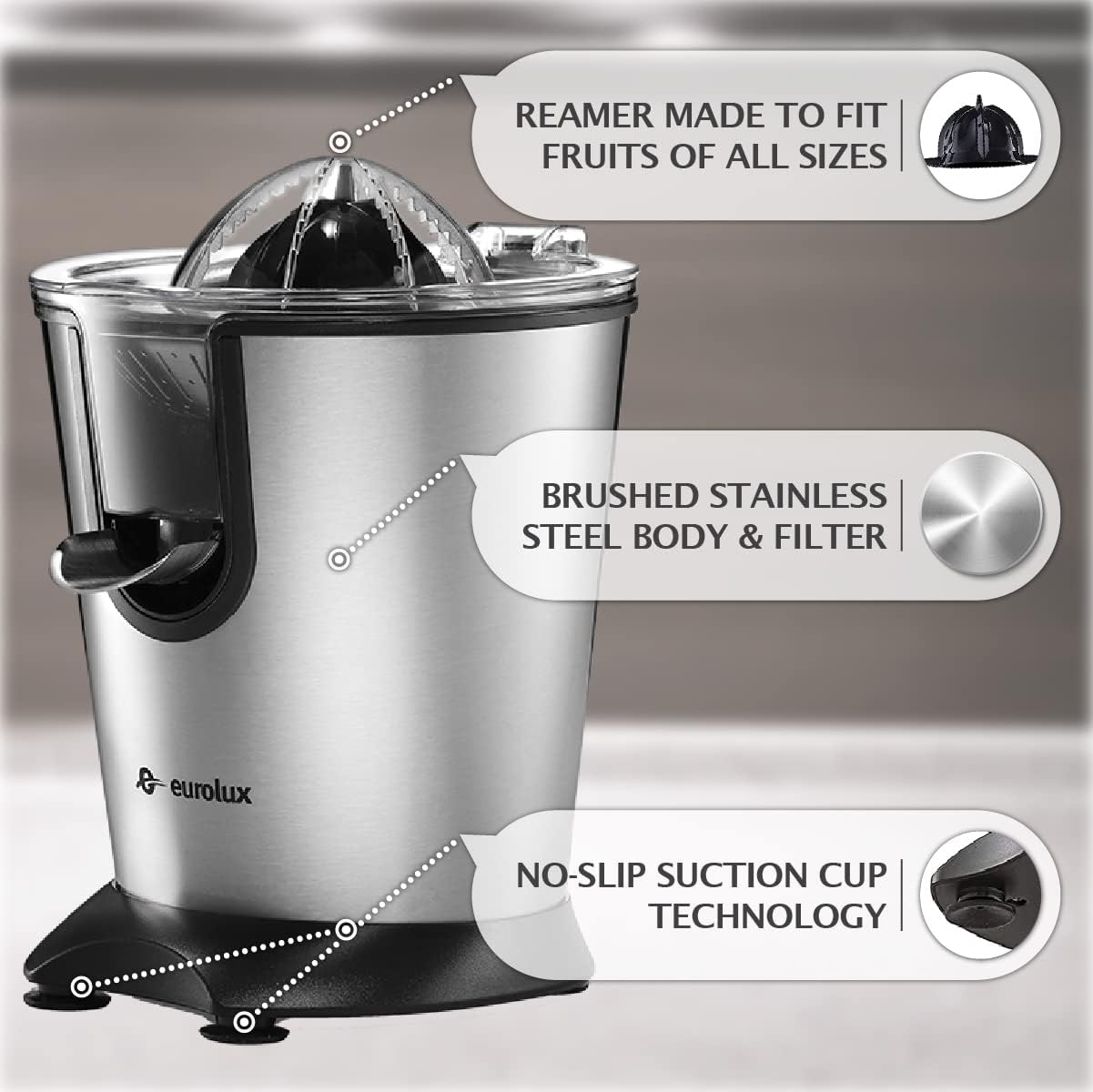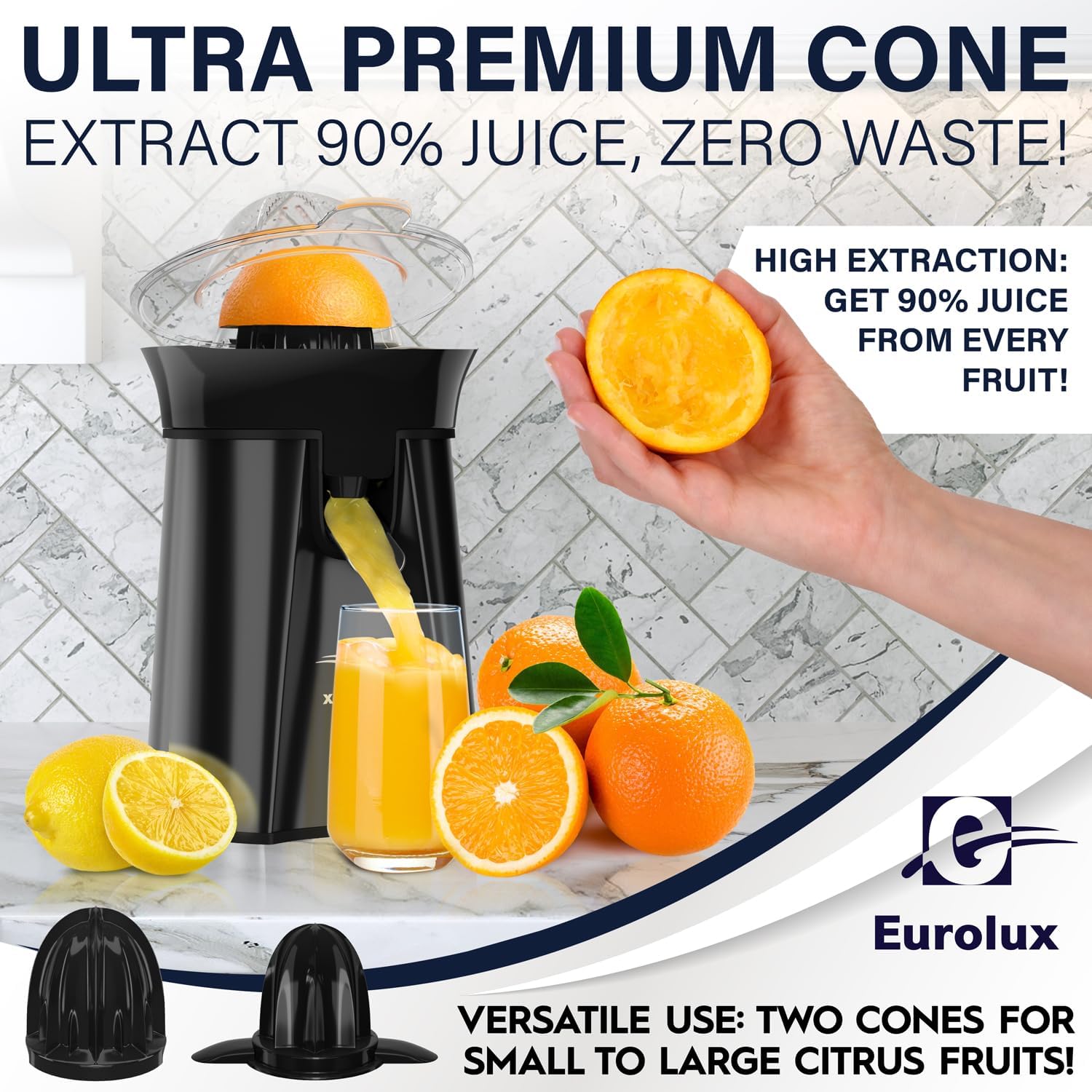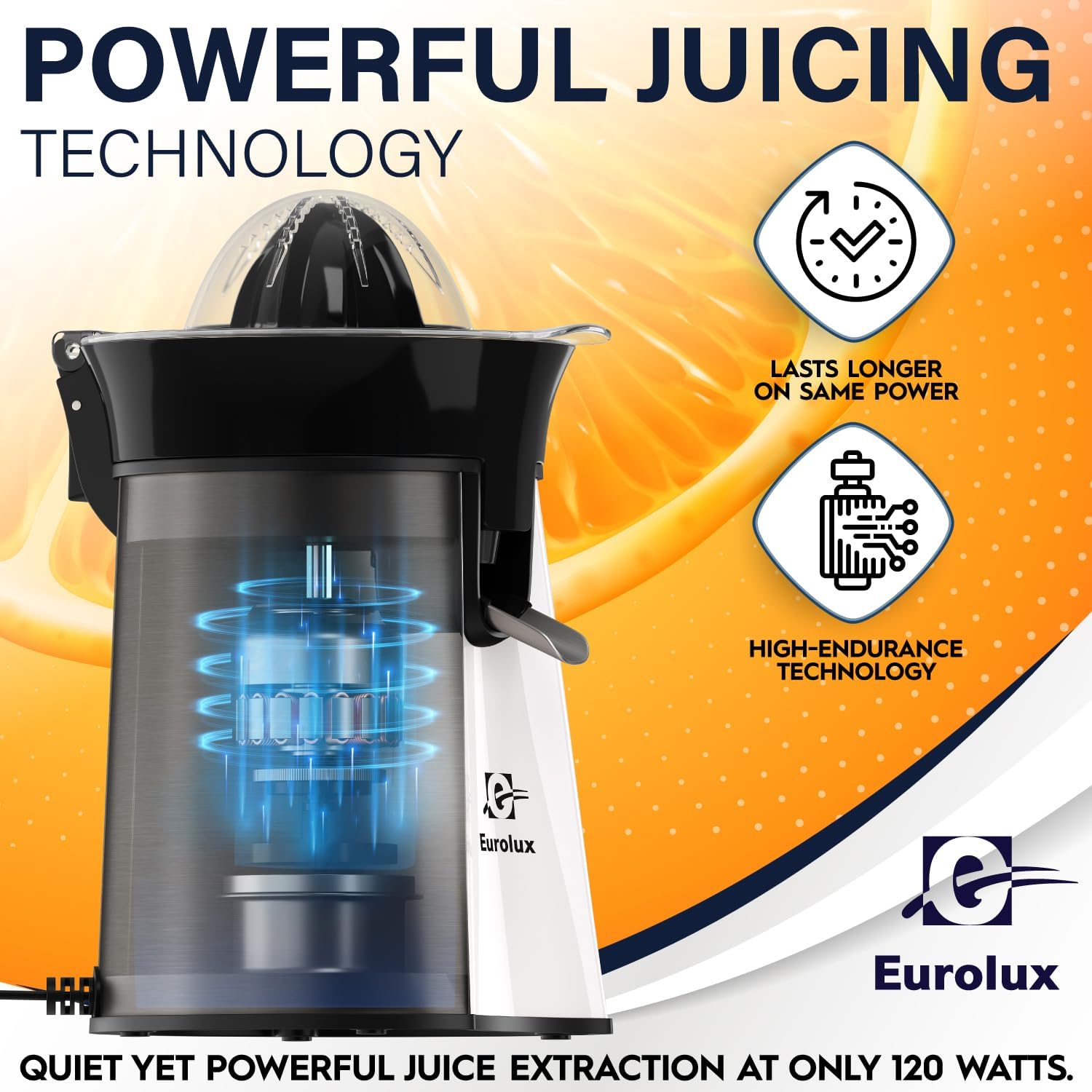 • SUPERIOR JUICING POWER — It wields a 160W high-torque motor so you can experience commercial-grade juicing power at home with your electric citrus juicer, which means you can effortlessly squeeze every drop of health into your glass with the efficiency and quality that only Eurolux delivers.