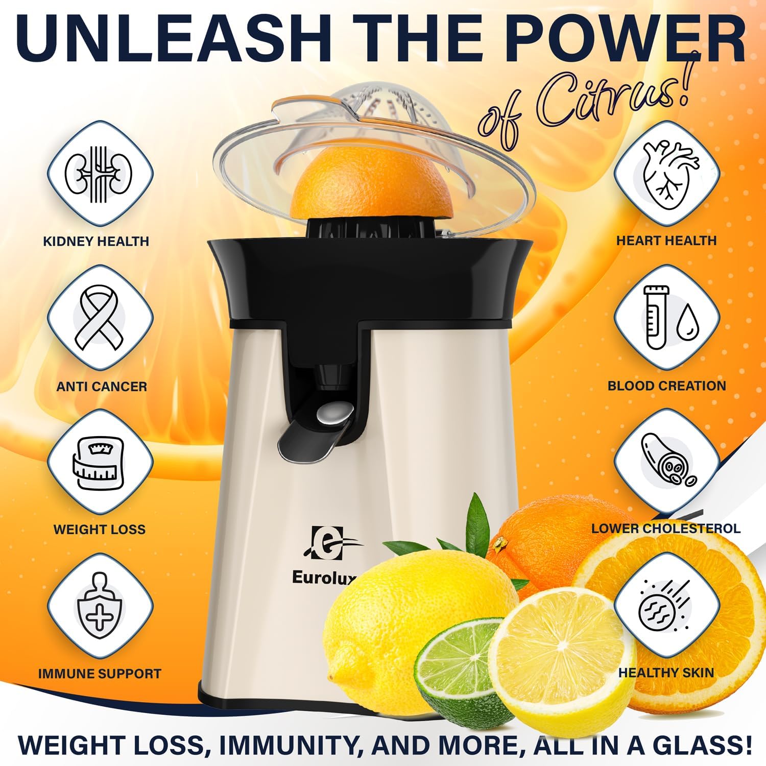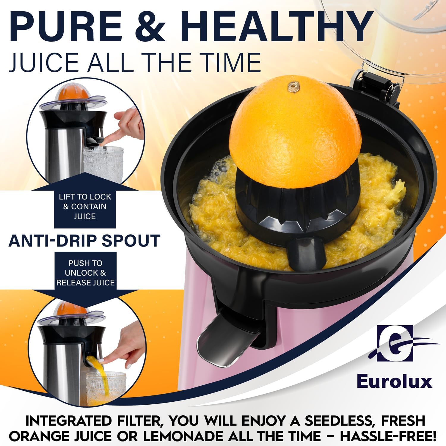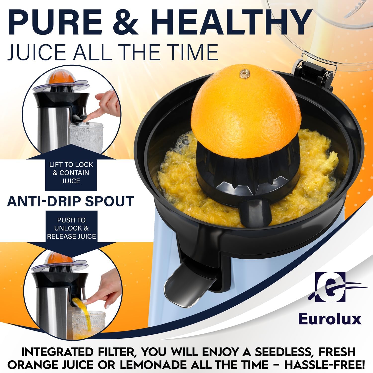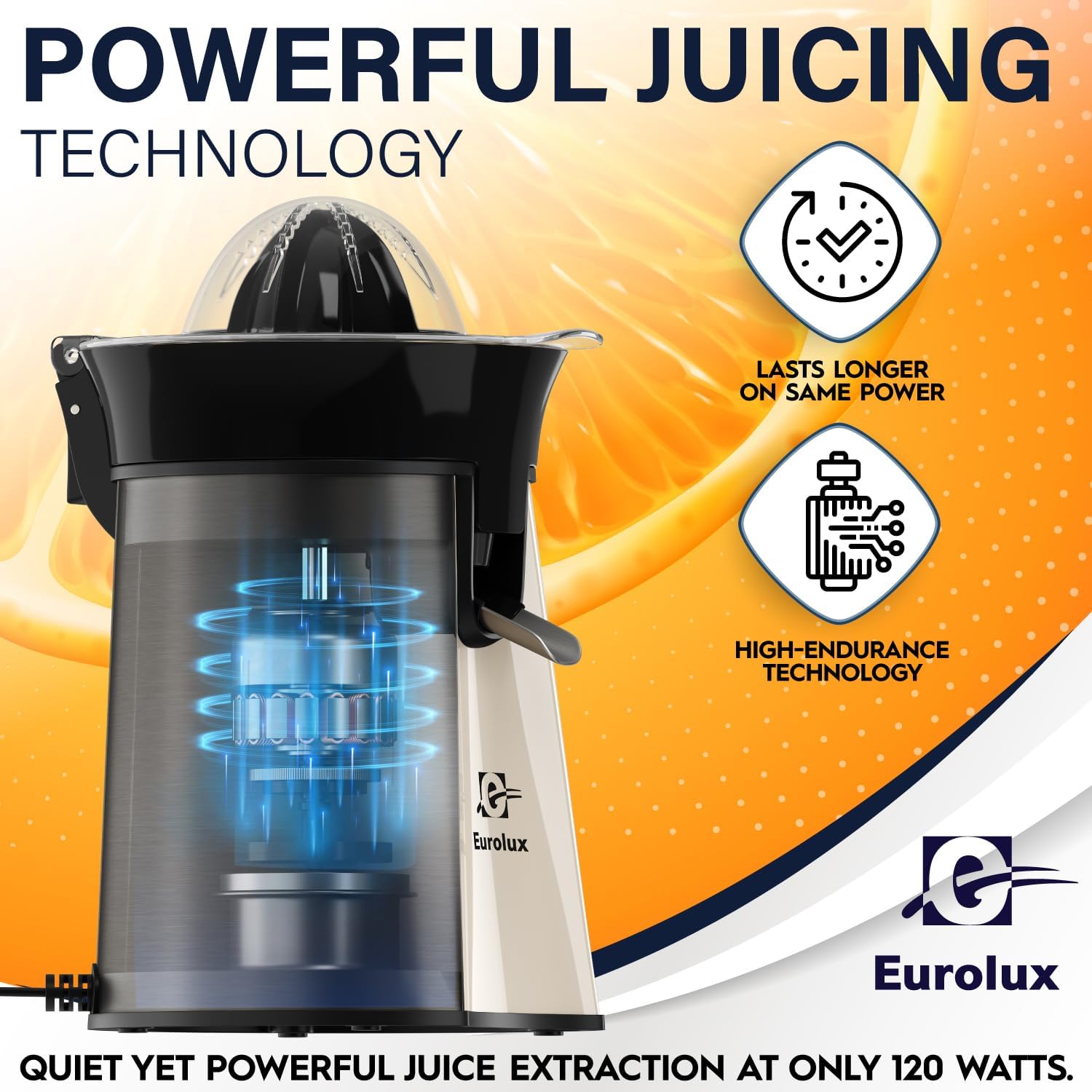 • SUPERIOR JUICING POWER — It wields a 160W high-torque motor so you can experience commercial-grade juicing power at home with your electric citrus juicer, which means you can effortlessly squeeze every drop of health into your glass with the efficiency and quality that only Eurolux delivers.
