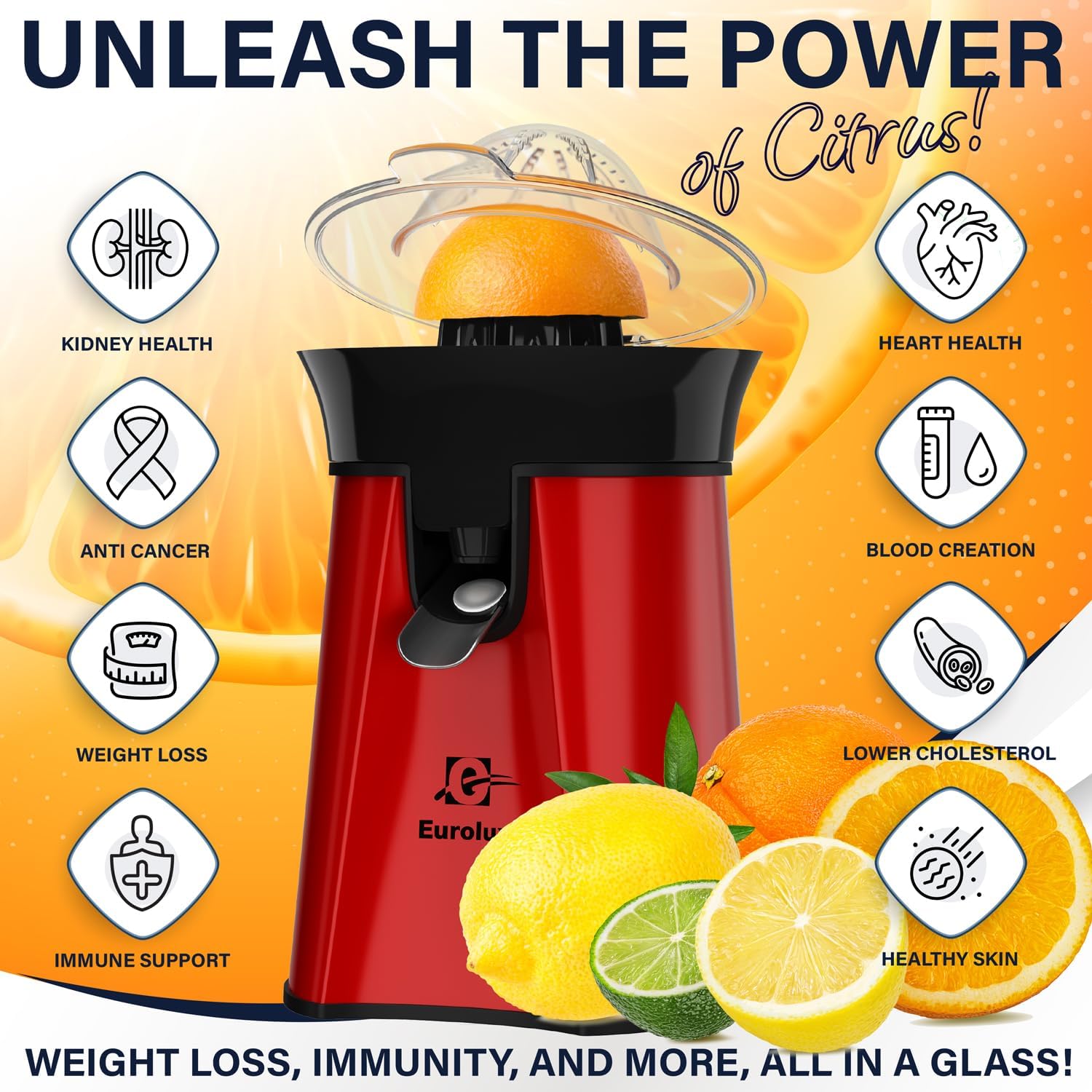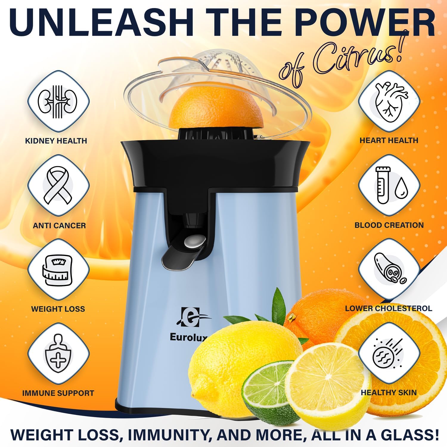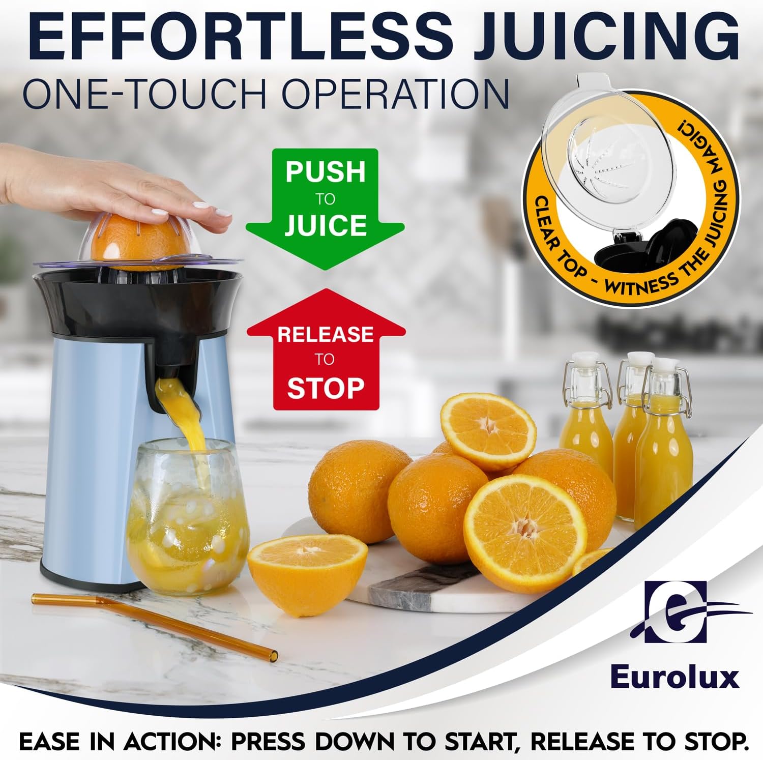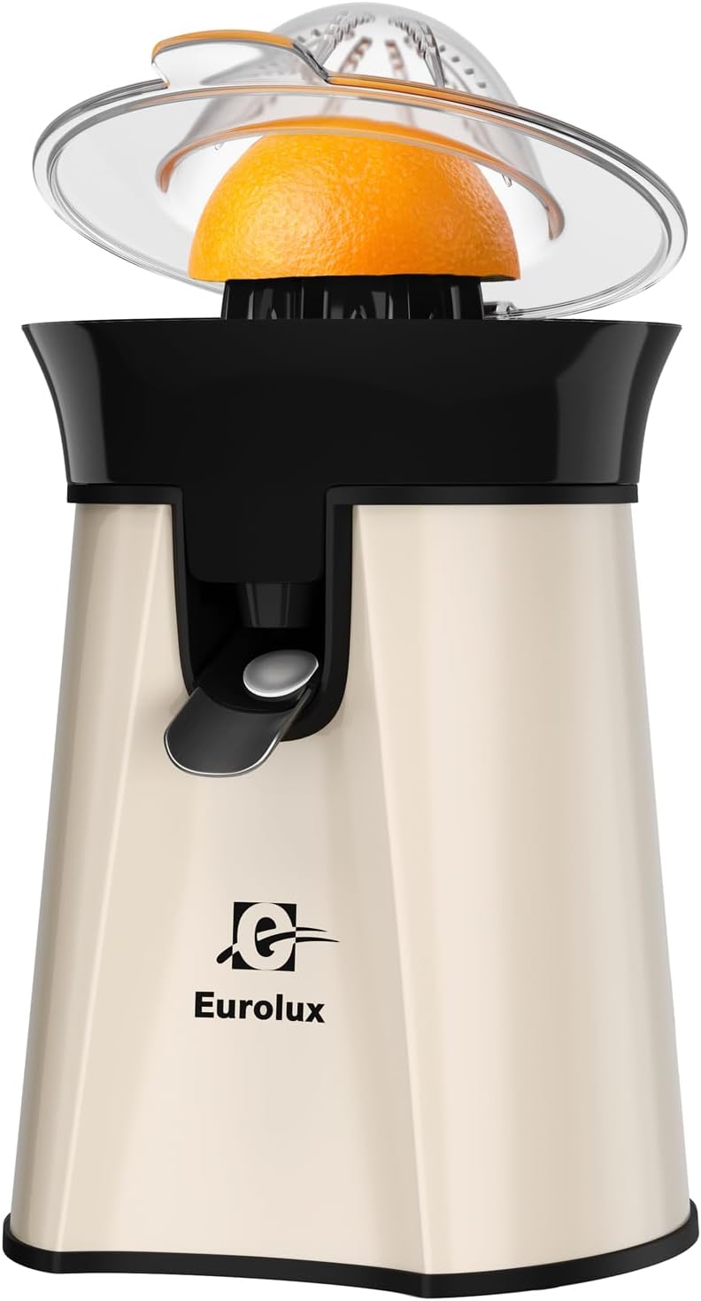 • SUPERIOR JUICING POWER — It wields a 160W high-torque motor so you can experience commercial-grade juicing power at home with your electric citrus juicer, which means you can effortlessly squeeze every drop of health into your glass with the efficiency and quality that only Eurolux delivers.