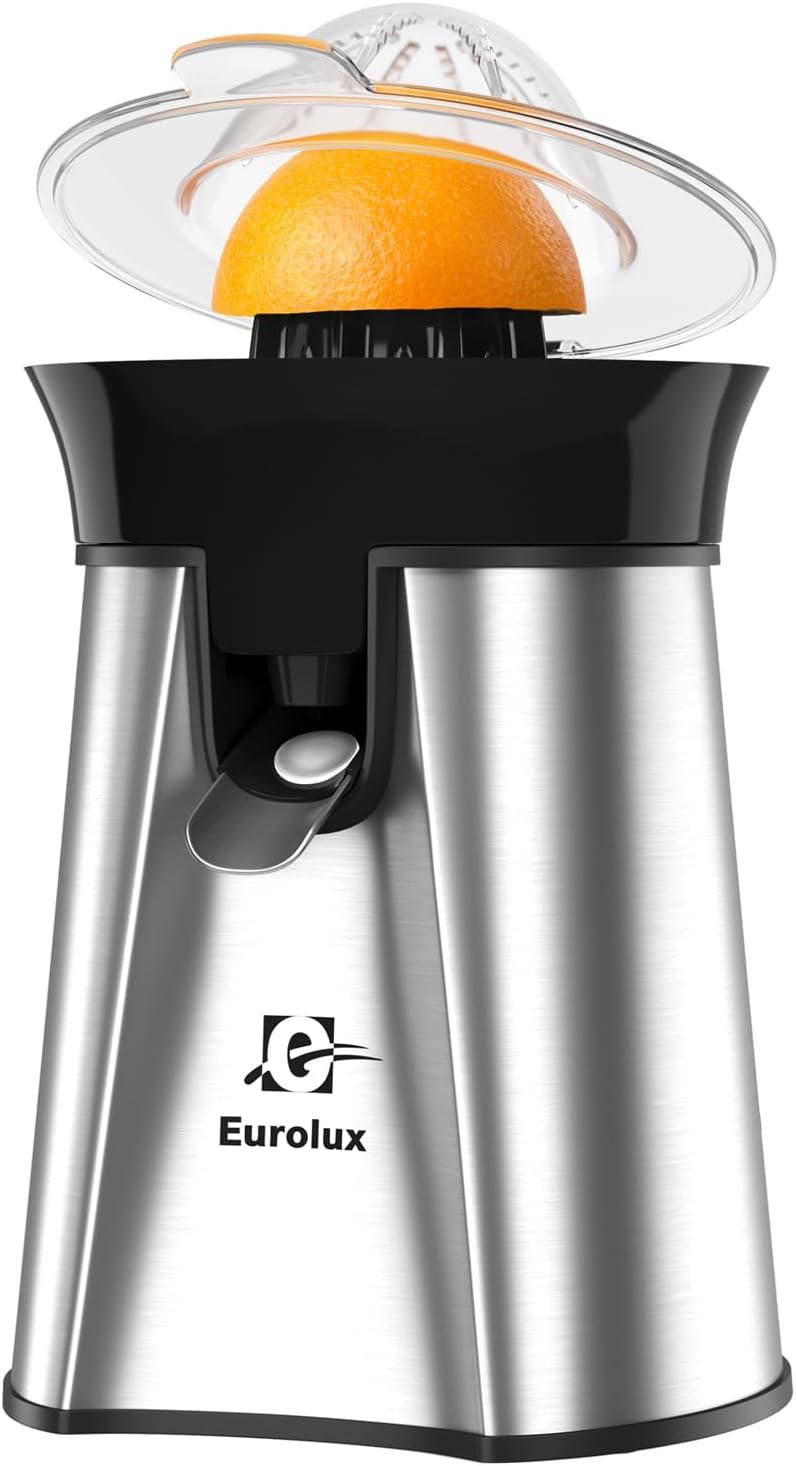 Eurolux Premium Electric Orange Juicer | Stainless Steel Citrus Squeezer With New Ultra-Powerful Motor and Soft Grip Handle for Effortless Juicing, Auto Shutoff, Dishwasher-safe Parts, Pulp Control