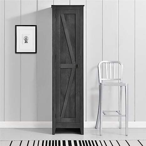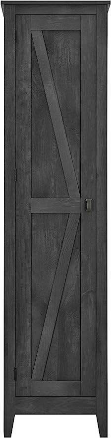 Farmington Wide Storage Cabinet is a stylish way to stay on top of your organization. The rustic barn style design and sleek tapered feet gives the look of an old weathered cabinet but the sturdy laminated particleboard and MDF make this cabinet the perfect piece to house your home office supplies, extra linens, seasonal clothing, nonperishable food and more! Open up the door to 4 spacious shelves, 2 adjustable, to fit items of differing sizes. The weathered brown finish with gray undertones will bring a nice rustic appeal to your space. The Farmington Cabinet is recommended to be assembled and moved by 2 adults. A wall anchor kit is provided for extra safety and security. After assembled, this cabinet measures to be 71.9”H x 18.2”W x 15.8”D.
