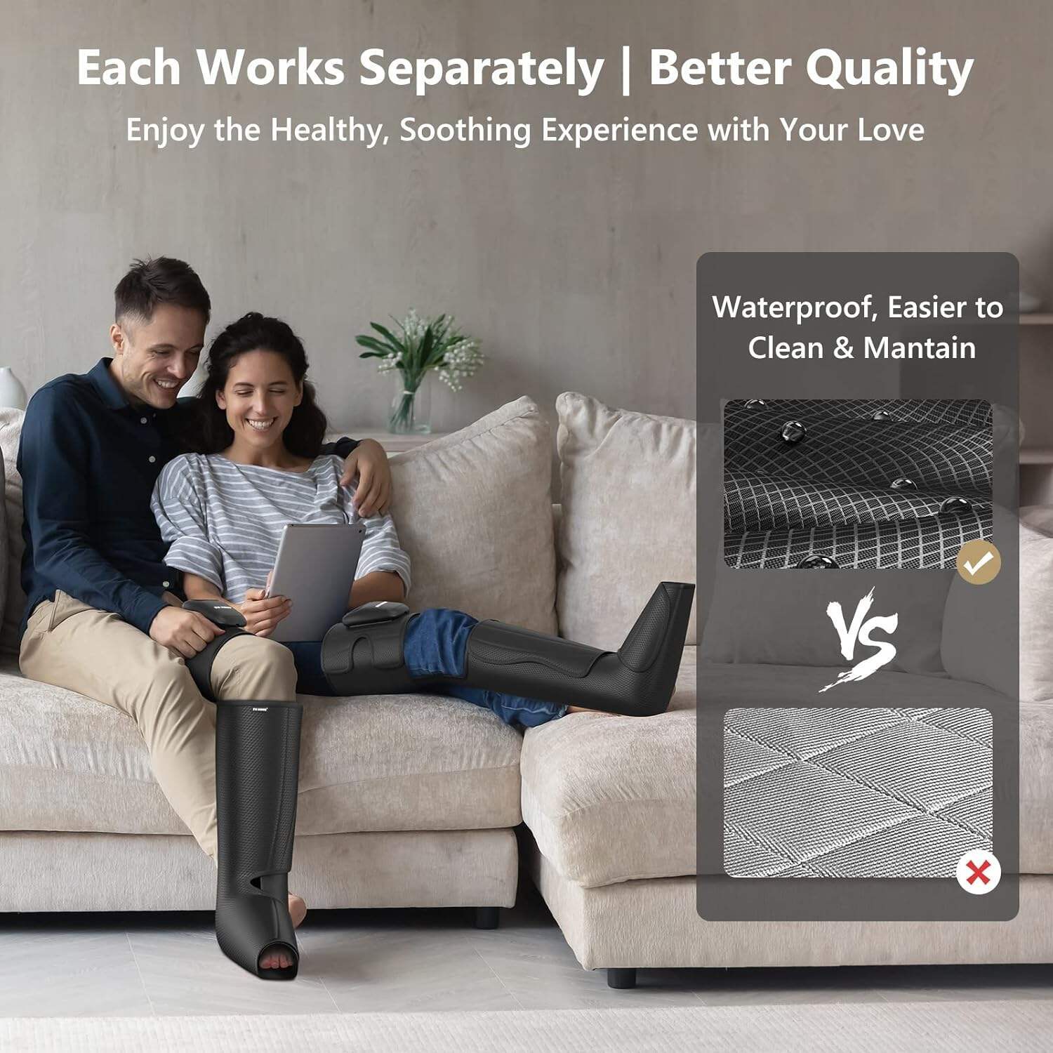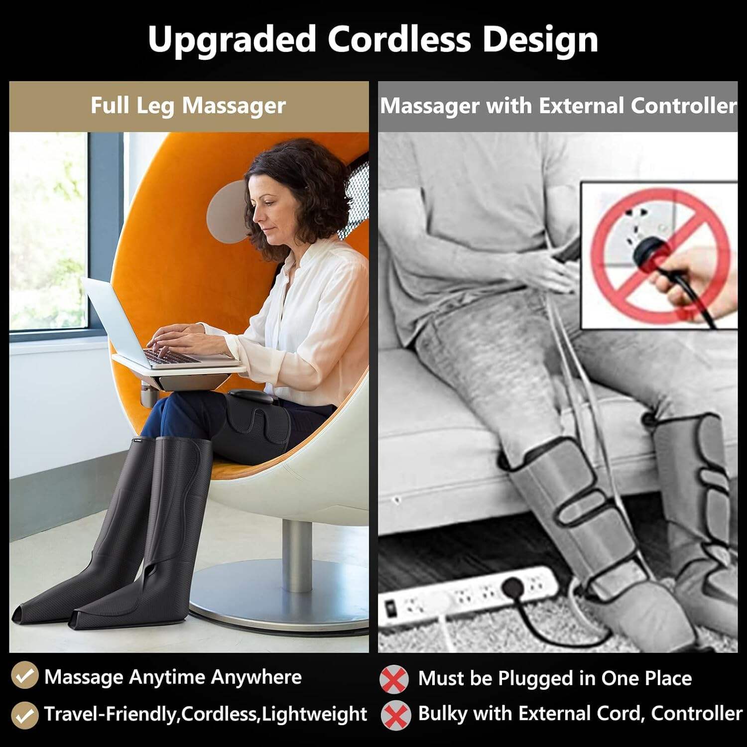 - Rechargeable & Cordless - This is an ALL-IN-ONE leg compression massager machine, cordless and rechargeable, no external controller and tubes, each wrap has a 3000mAh battery inside, you can use them at home, in the office or on travel. EACH SIDE CAN BE USED indenpendently.