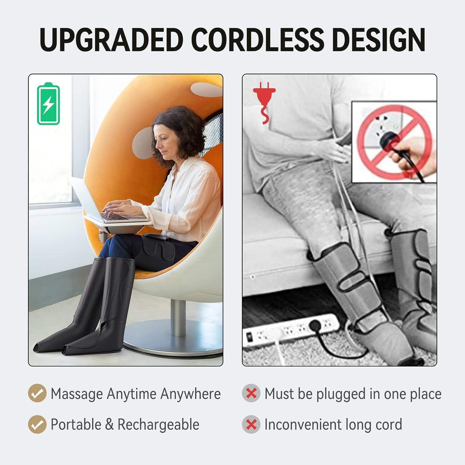 - Improve Performance & Muslce Recovery- This CORDLESS pneumatic leg massager has 2 built-in large flow motors and 4x4 bigger massage chambers, can quickly massage from toes to thighs. Simulating kneading and stroking of tissues, indicated for the relief of muscle aches and pains and increase in circulation to the massaged areas, effectively help to accelerate healing and recovery, improve your daily performance and fast recovery after training or exercise.