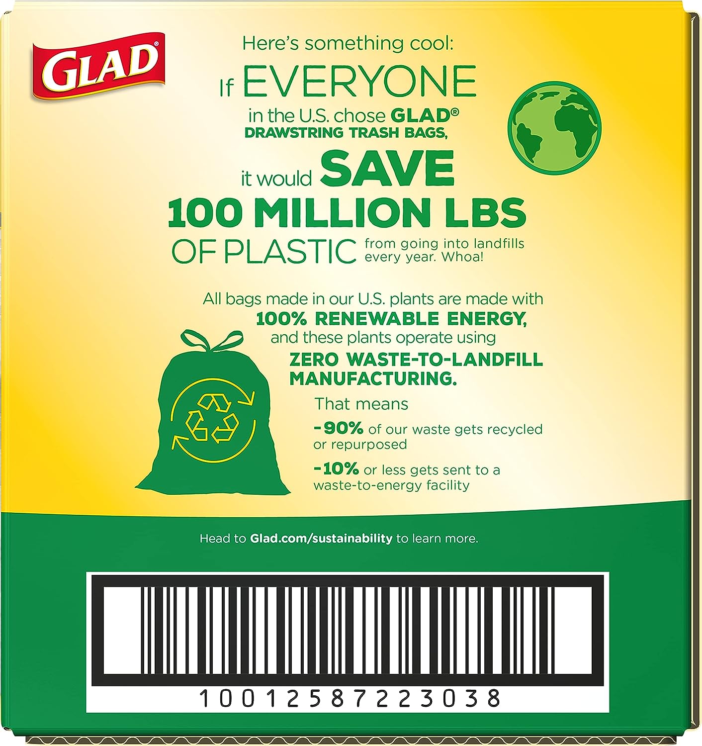 - MADE WITH 100% RENEWABLE ENERGY: These Glad 13 gallon kitchen garbage bags are made with 100% renewable energy and 100% recycled paperboard packaging