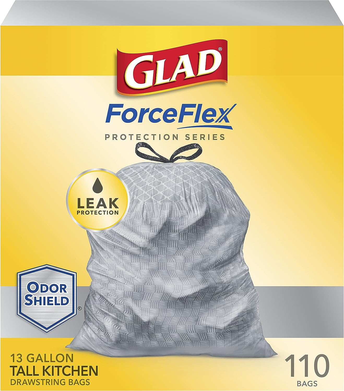 - 13 GALLON PLASTIC TRASH BAGS: Glad Tall Kitchen Drawstring Trash Bags with stretchable strength, traps, locks and neutralizes odors to keep your kitchen smelling fresh with OdorShield; Packaging may vary