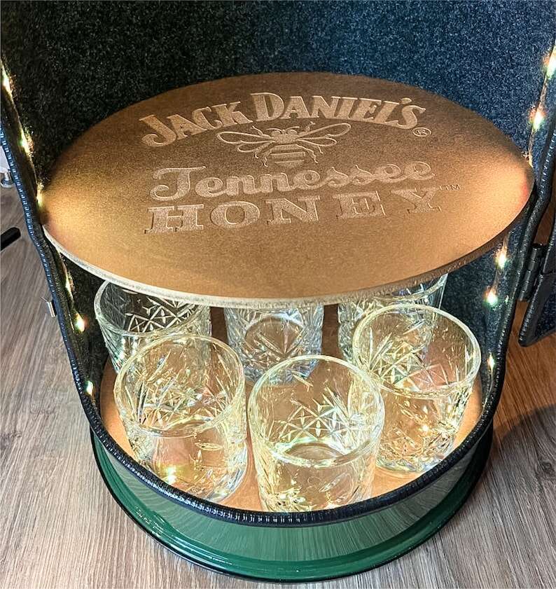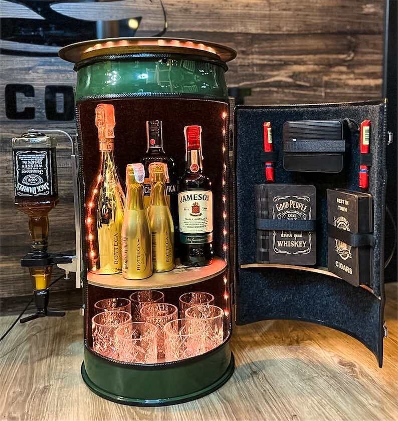It is made of a metal barrel, can be securely locked with locks, height 63 cm and diameter without top table 30 cm. You can paint the barrel in any color you like. Inside, there is a bright backlight that can be controlled with a remote control, powered by a power bank or charged from the mains. At the top there is a removable rotating table, which can hold 6-8 bottles, 6 glasses. On the door there is a cigarette case and a box with cooling stones for whiskey (any engraving can be done on the boxes).