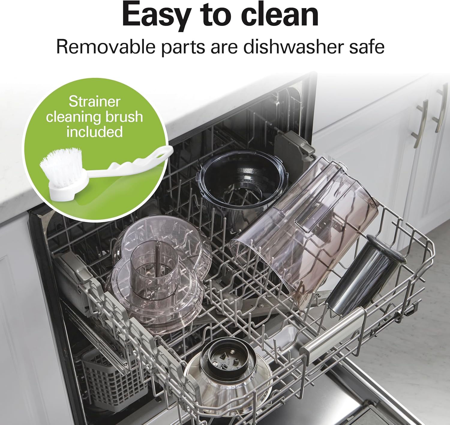 - EASY TO CLEAN: Cleaning up after you juice is easy. The juicer machine comes with a convenient strainer cleaning brush, and the pulp bin, juice bowl, lid and pusher are all dishwasher safe.