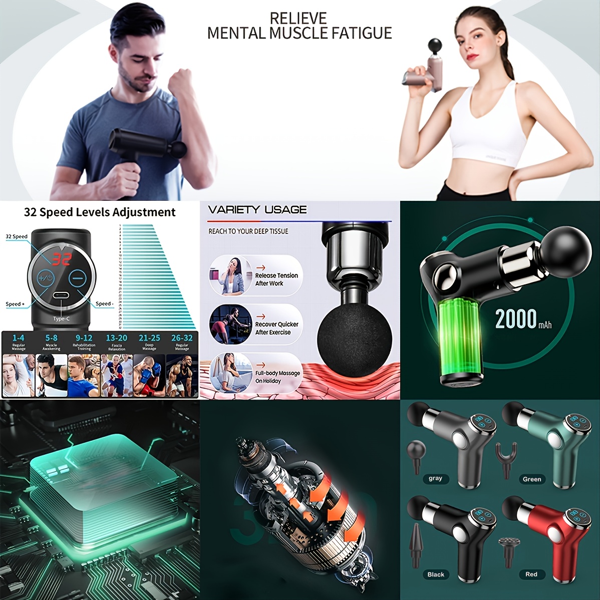 32 speed settings: Choose a different speed according to the muscle group from 1200 to 3200 RPM / Min