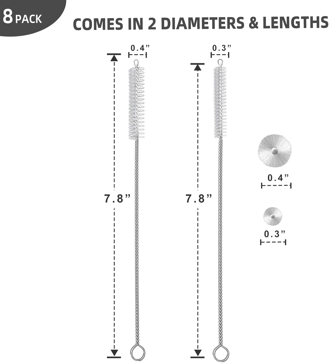 - MULTIPLE SIZE » Set includes 4-piece 7.8" x 8 mm straw brush and 4-piece 7.8" x 10 mm straw brush. Overall length: 7.8", Bristle Diameters: 8 mm, 10mm. 7.8" length with 8 mm and 10 mm diameter sturdy brush head, reaching the entire inner surface of the straws and pipes for a thorough clean.