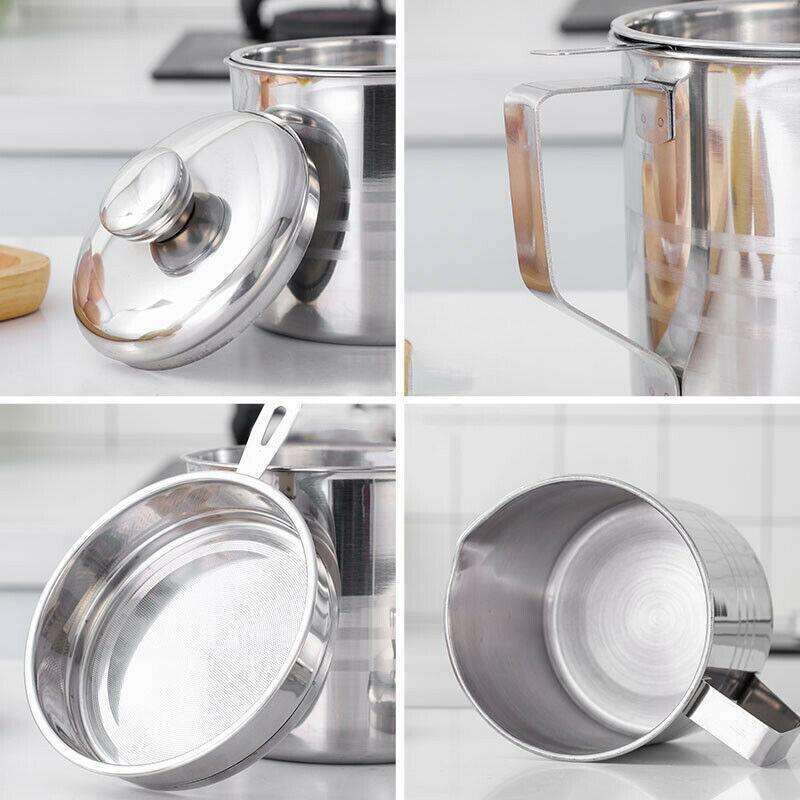 This grease can is good for 5 cups (1.25 quart or 40 fl oz) of yummy fat straight out of the pan. Made out of stainless steel, use in your kitchen as a grease strainer and cooking oil filter to store your dipping.