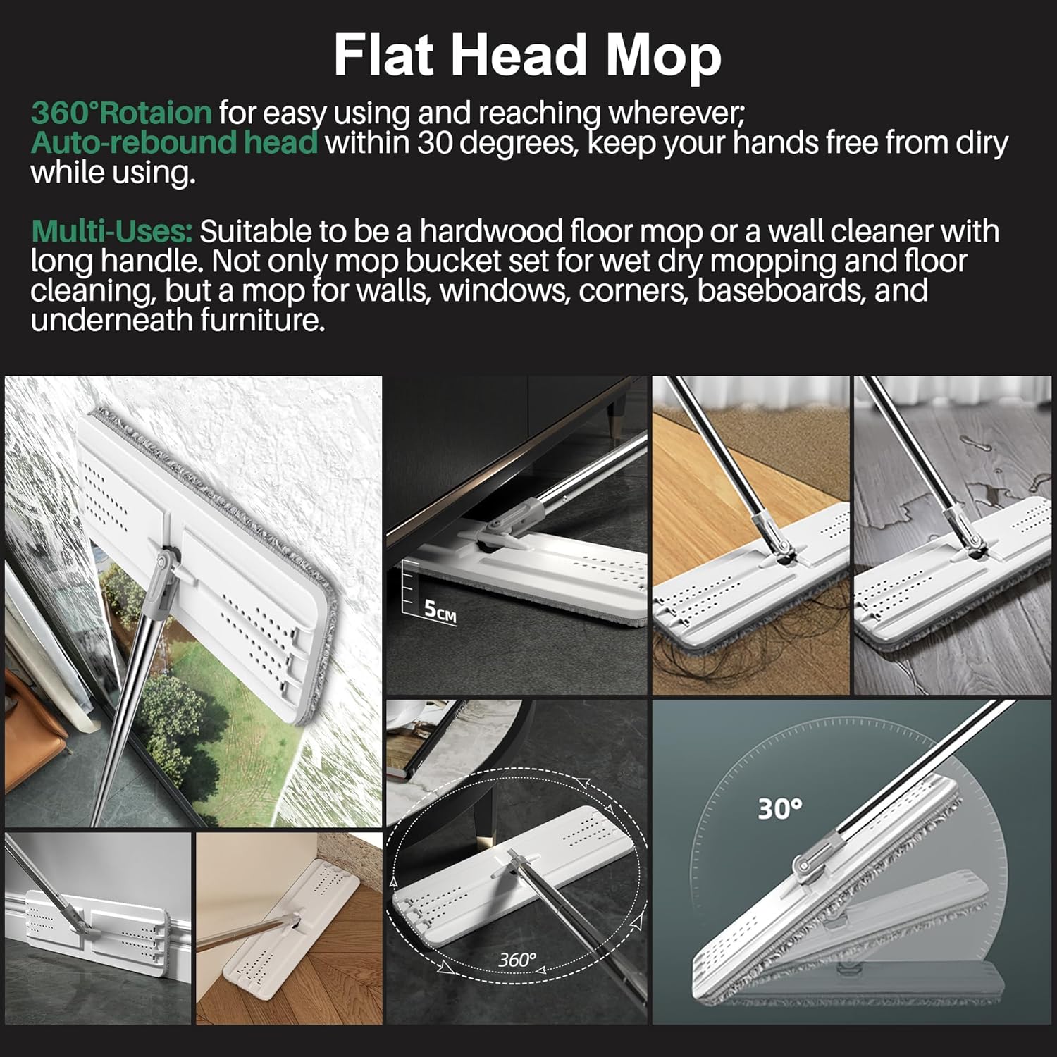 - [Corner and High?] 360° rotation flat mop-head can reach to any corners and those "under-the-whatever" places. The adjustable Stainless Steel Handle can be extended from 26.5 to 60.9 inches, much suitable to be a Wet Dry Mop for walls, Wall Cleaner with Long Handle.