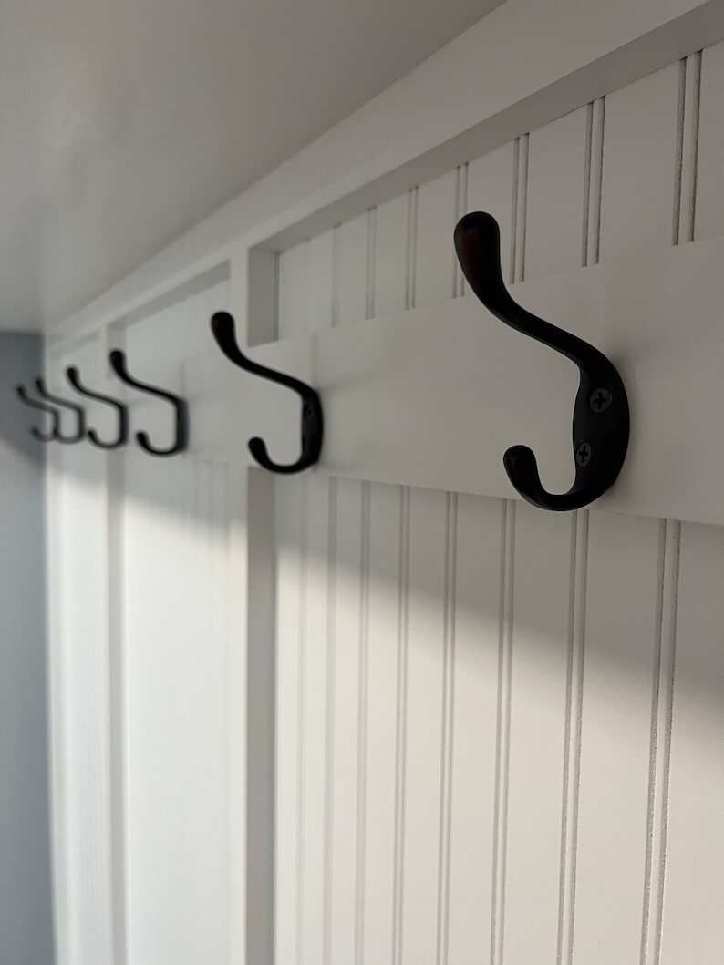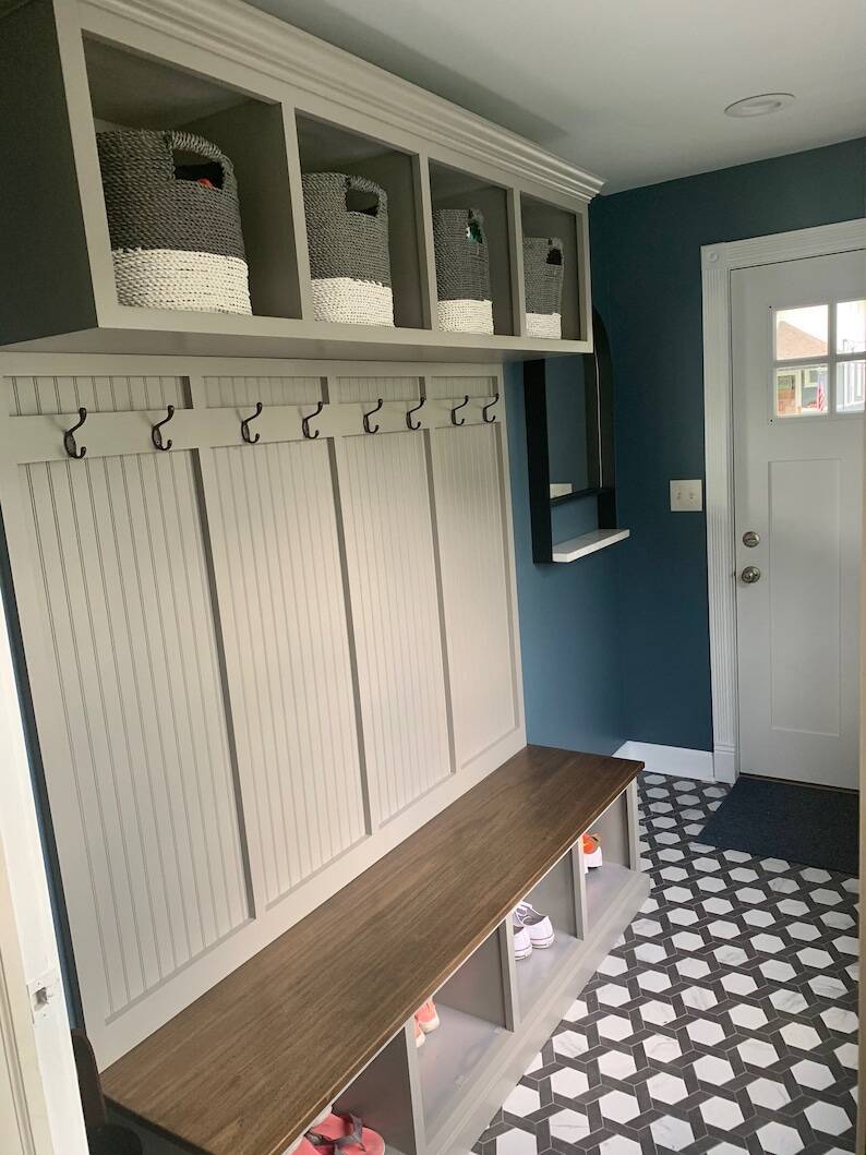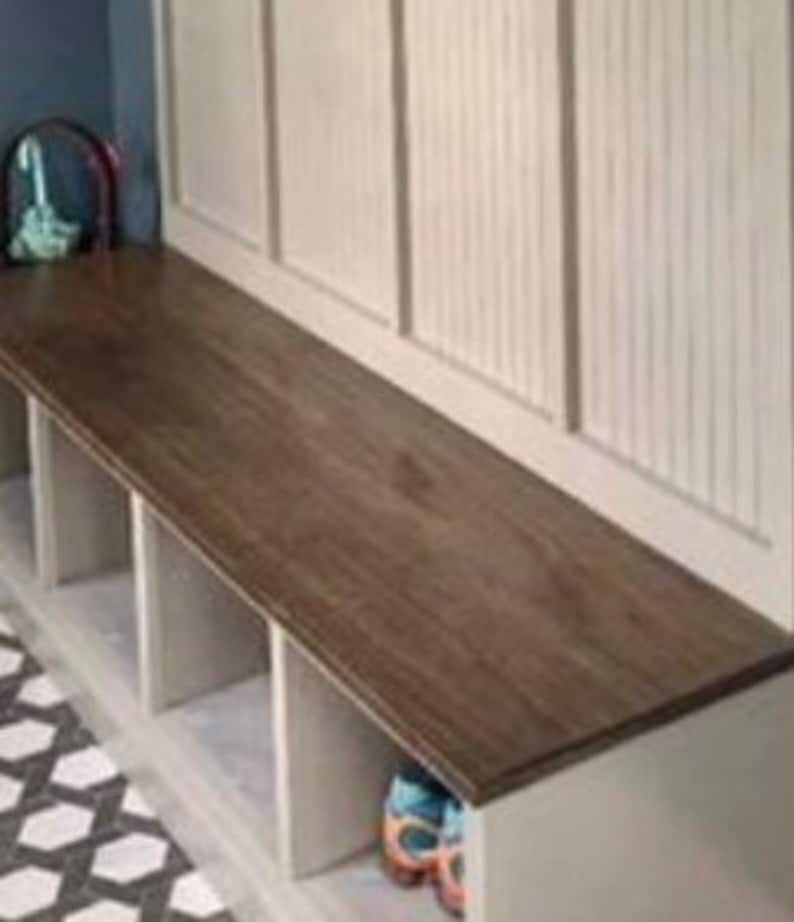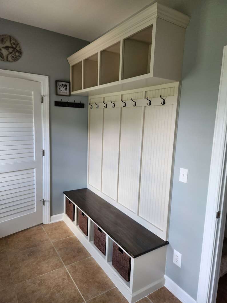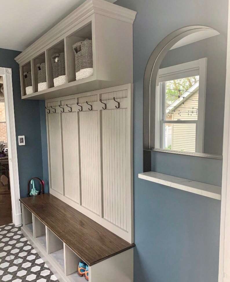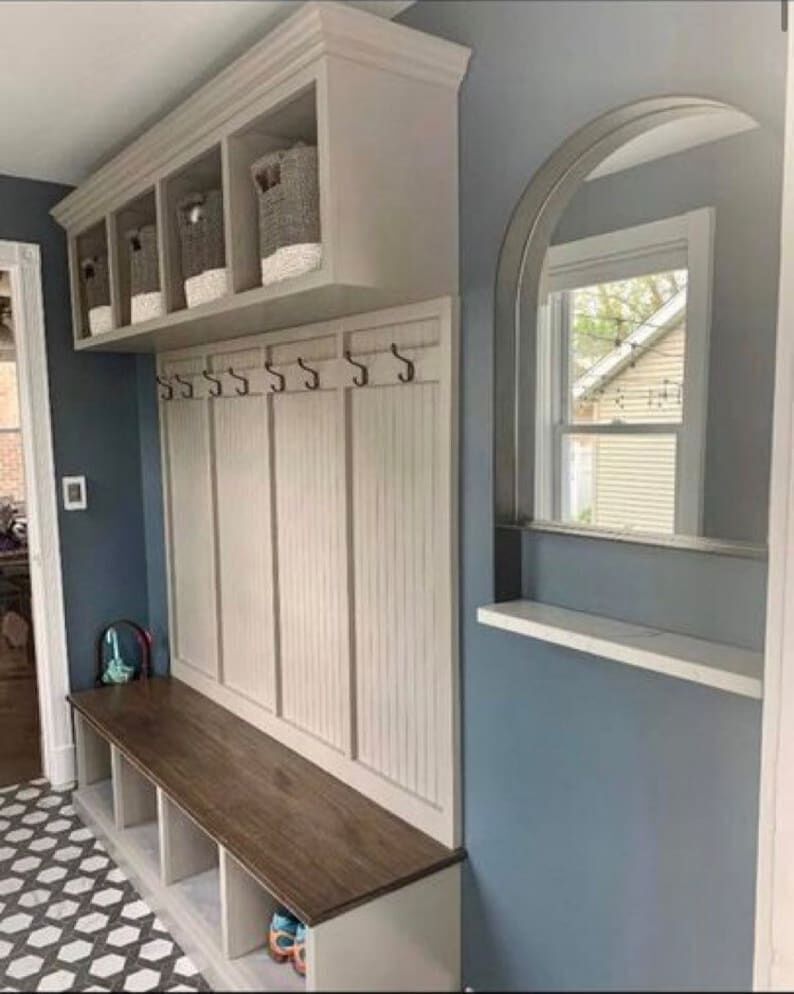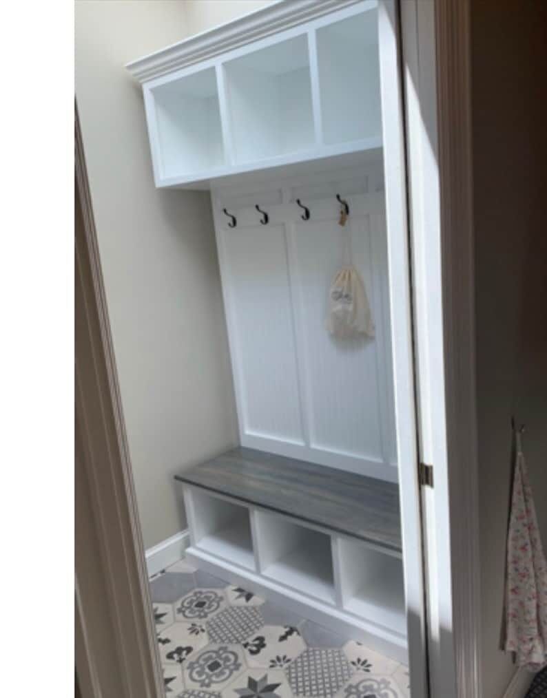 Mudroom hall tree with storage bench and coat rack that allows for the perfect place to put your shoes, coats and bags! This unit is handcrafted made to order, painted with lacquer paint and comes with 8 standard hooks.