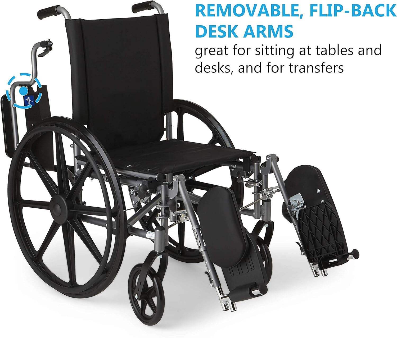 - Flip-back, desk-length arms make it easy to navigate under tables | elevating leg rests enhance comfort and remove easily