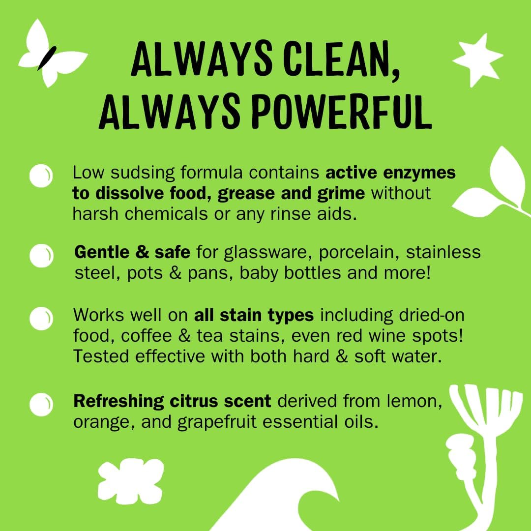 - POWERFUL YET GENTLE: Low sudsing formula contains active enzymes to dissolve food, grease & grime without the need for harsh chemicals or any rinse aids. Fragrance free, hypoallergenic. Works well on all stain types including dried-on food, coffee & tea stains, even red wine spots! Effective with both hard and soft water.