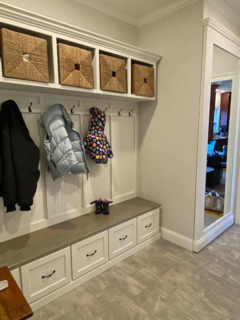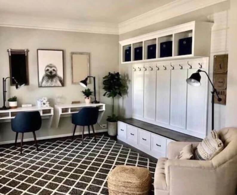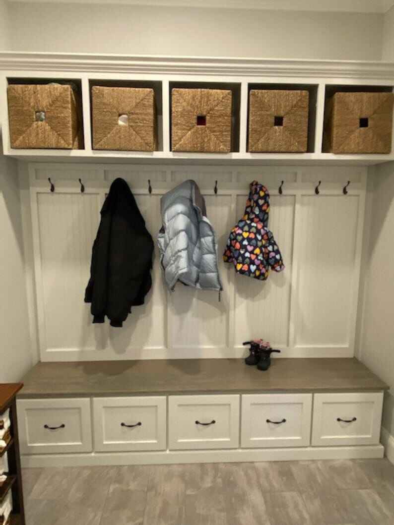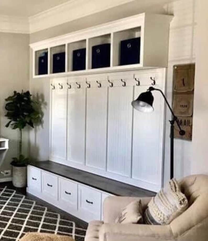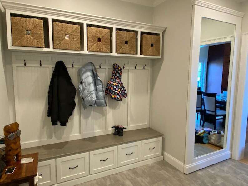 Mudroom bench entryway organizer with shoe storage and a coat rack makes for a great entryway organizer for any home! This unit is made to order and comes with 10 hooks and the drawers come with 100 pound drawer slides.