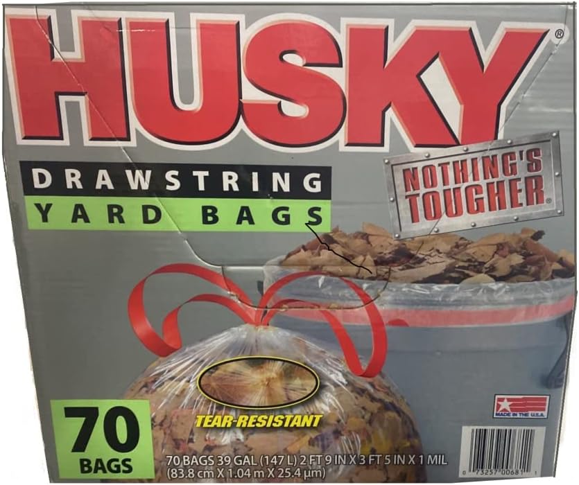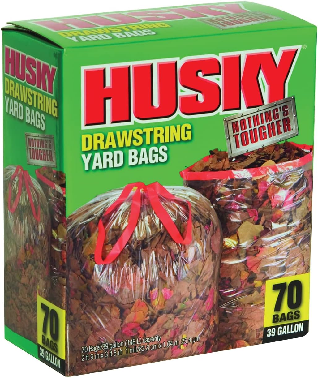 - Husky Yard Bag, 39 Gal Capacity, 3 Ft 4 In Length, 2 Ft 9 In Width, 1 Mil Thickness, Drawstring Closure, Clear, For Composting And Weeding