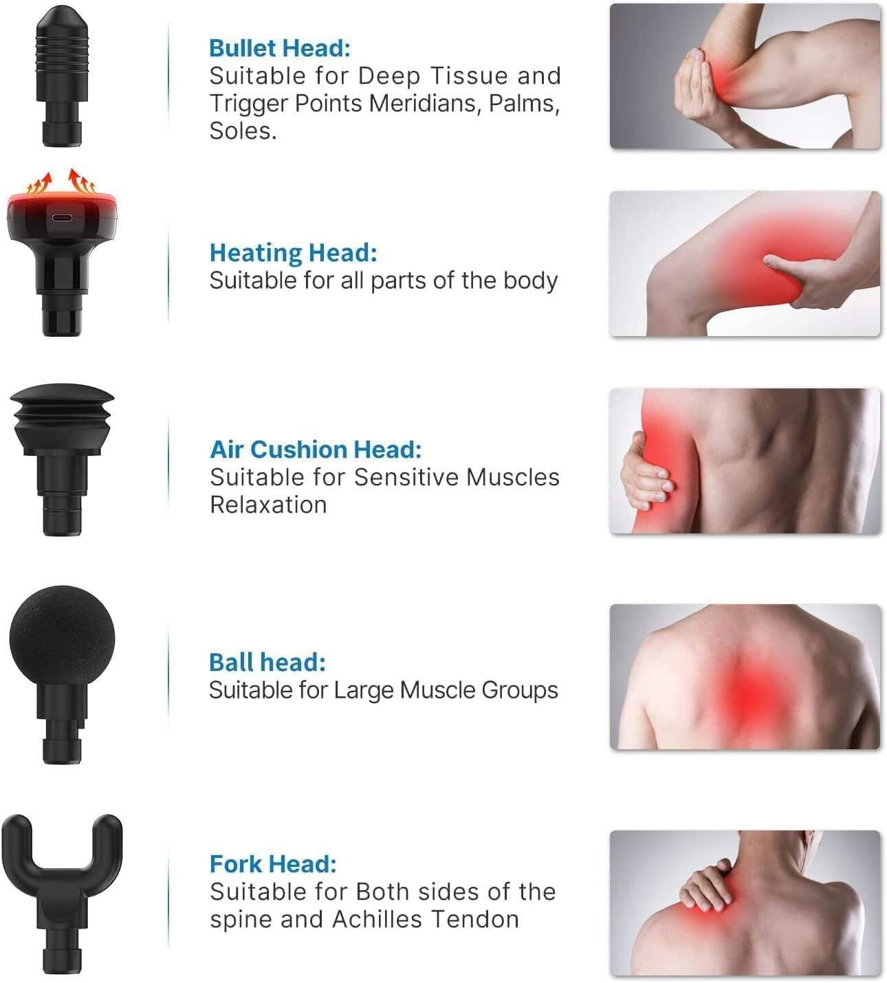 - Up to 3200rpm(5 speeds) & 5 Massager Heads: 5 speeds from 1800 to 3200rpm are provided for different muscle groups, aiding in sore muscle massage, relax and shape different muscle parts; choosing from 5 different shaped massager heads, power on the device, you can start to relax your body parts