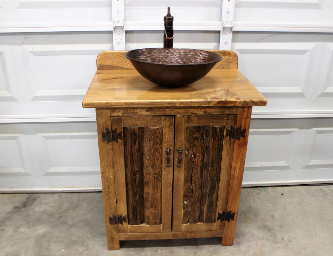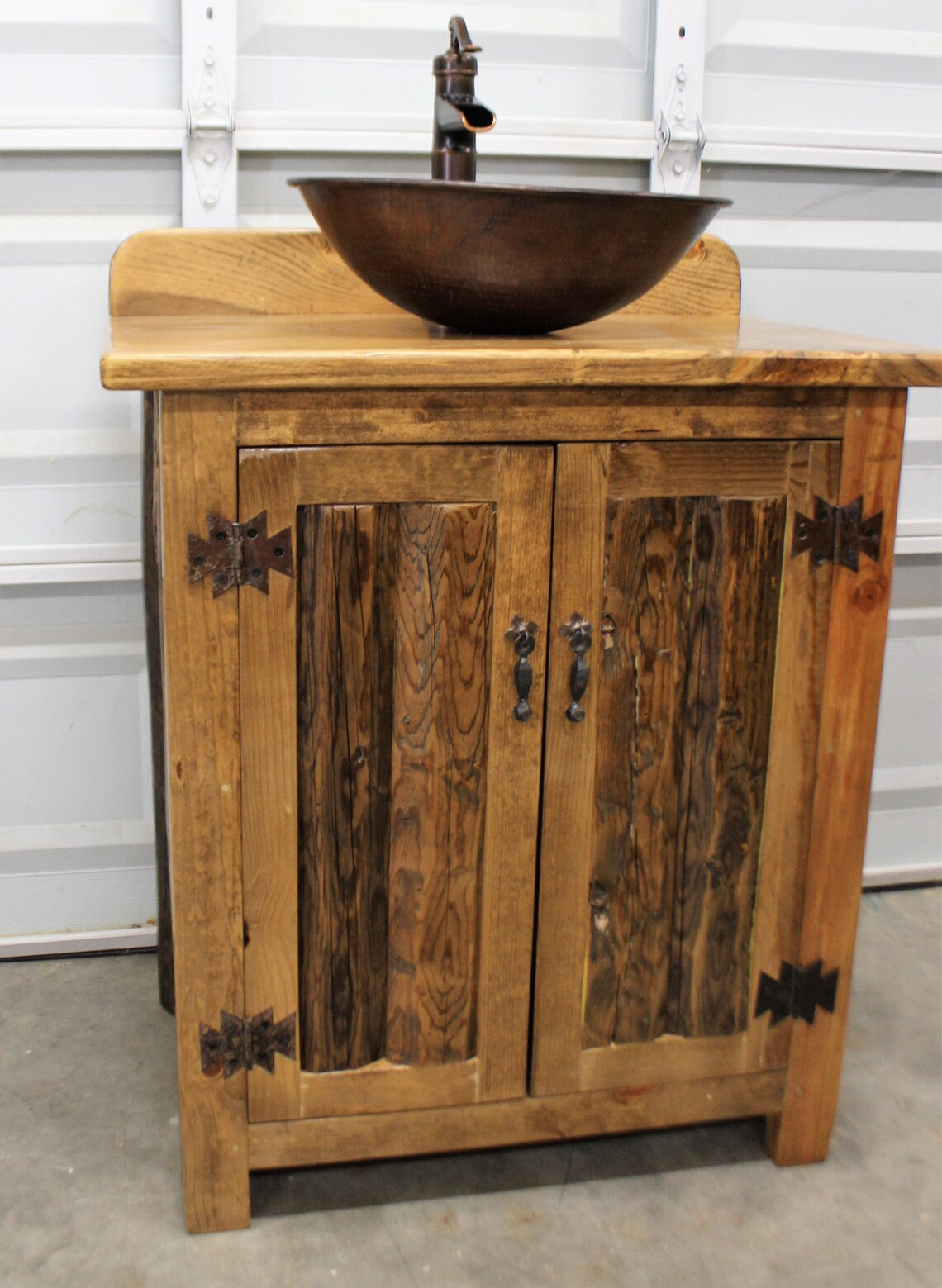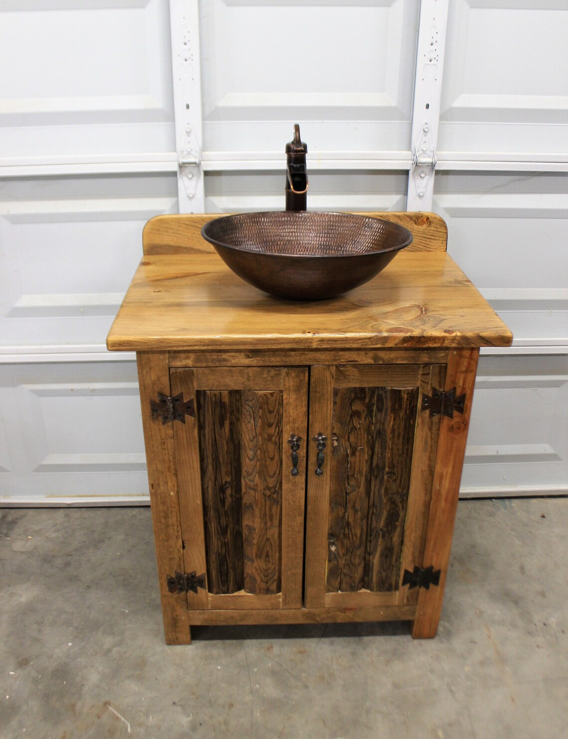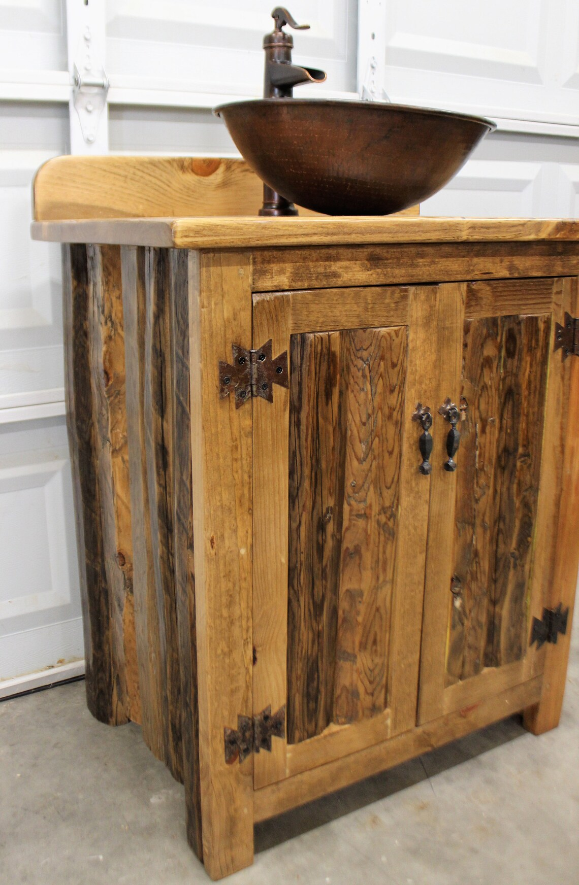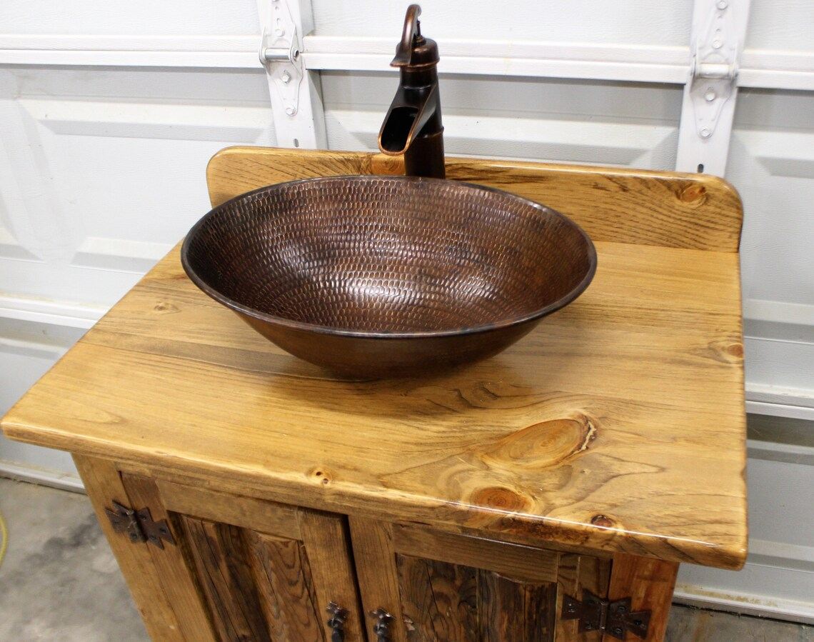 This Rustic Bathroom Vanity with copper vessel sink and log cabinet was built with very old, hand-cut pine logs, reclaimed from log houses. The wooden top is made with furniture grade pine.