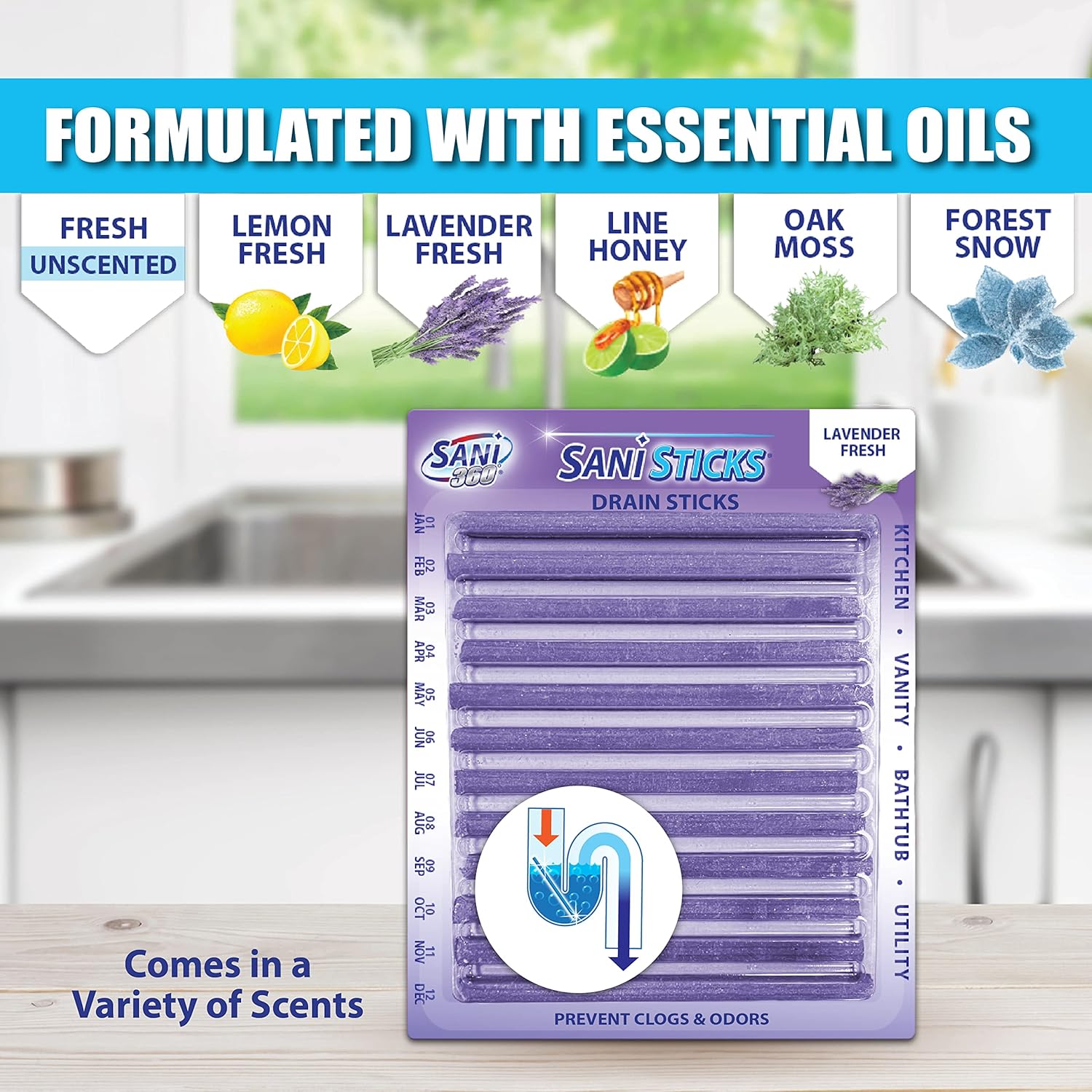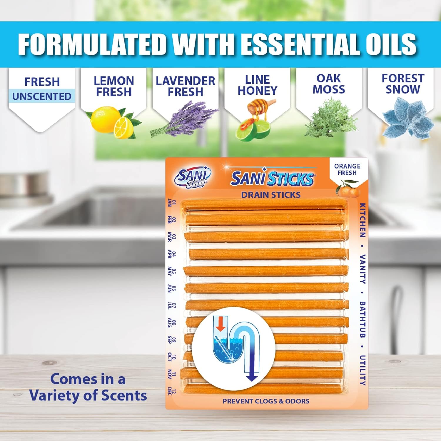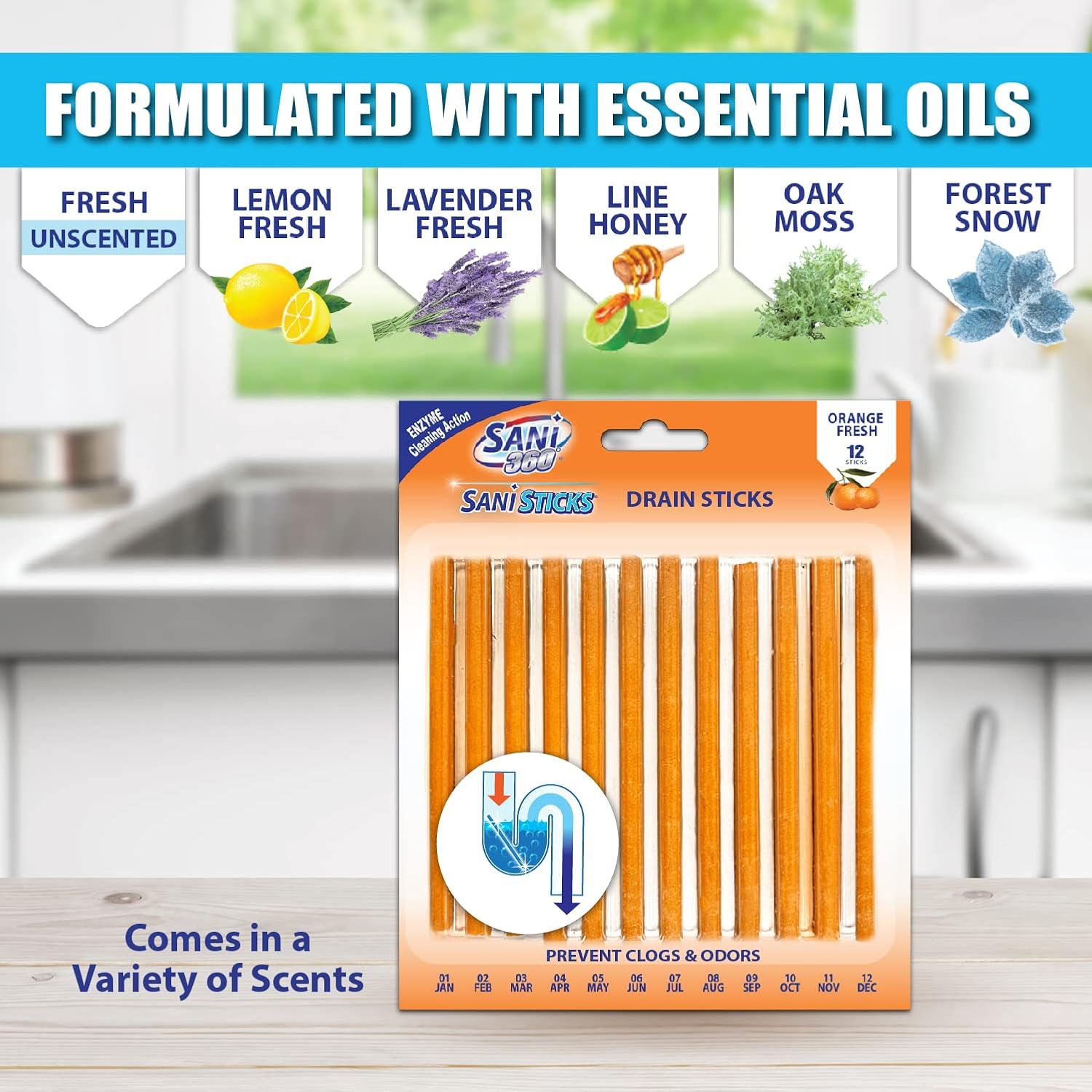 - SAFE TO USE IN ALL DRAINS: Sani Sticks fresh unscented odor-eliminating sink-cleaner sticks only use enzymes to clean, so they’re safe for use in all drains, from the bathroom to the kitchen. Keep your drains safer and smelling fresher with this drain and odor-remover monthly treatment. Sani Sticks are available in many fresh scents, including lemon, lavender, lime honey, orange, pine, apple cinnamon, oak moss, and forest snow.